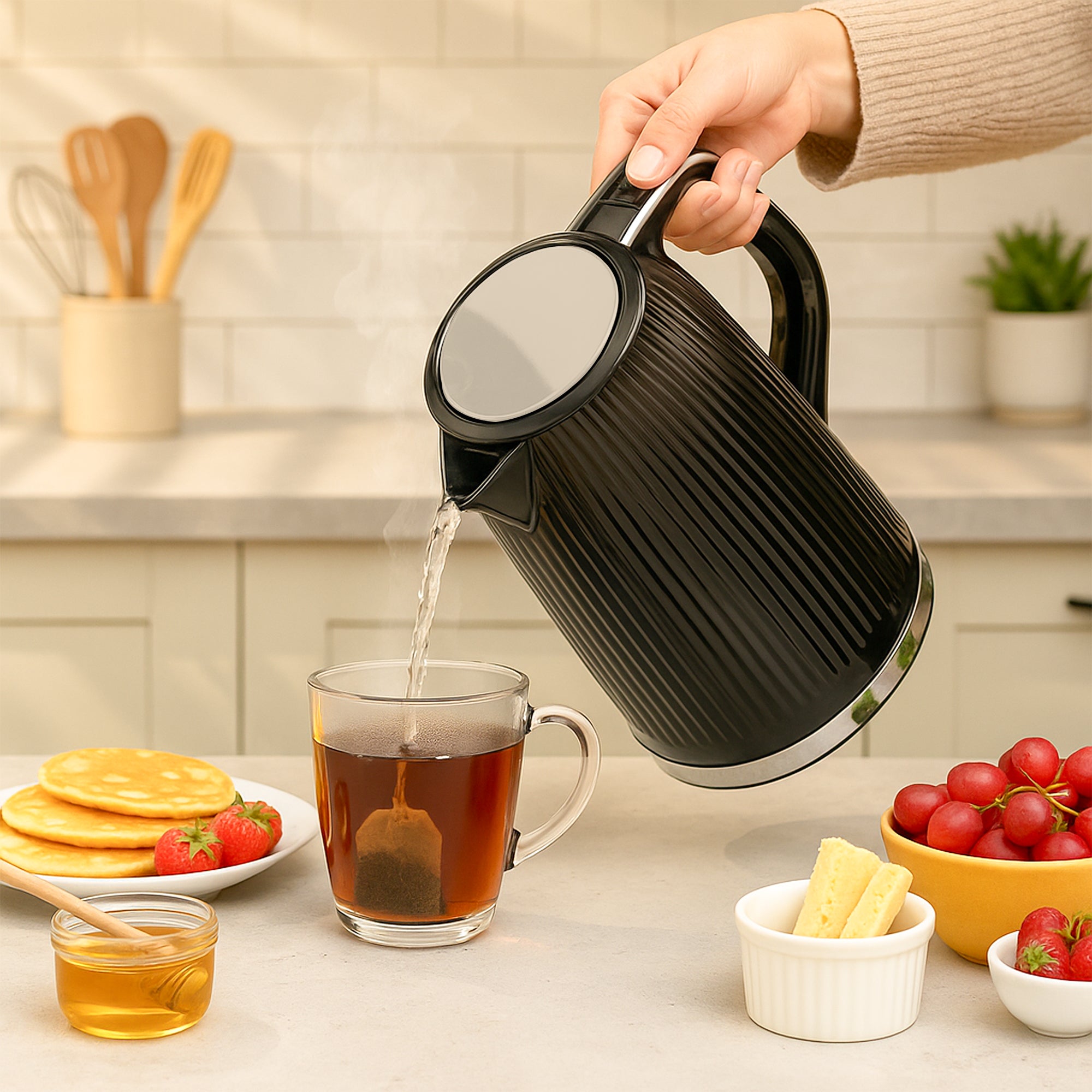 The 1.7L electric kettle is large enough to prepare 6-8 cuppas at once.