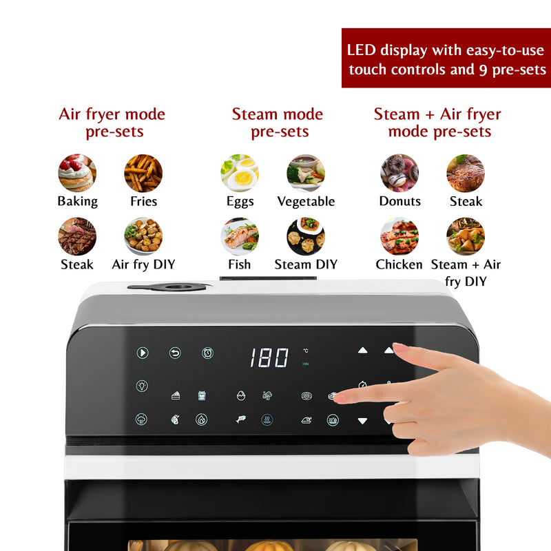 Remember to try the air fryer, steam mode, and combined mode. Place your food on the baking tray and insert it into the oven. If using the pure steam or combined mode, remember to fill the water tank with distilled water. Choose a preset and adjust time/temperature as needed. You can adjust settings during the cooking process as well. Once the oven beeps and automatically shuts off, use the oven mitts to take out the food. Ensure it is fully cooked, serve hot, and enjoy your meal!