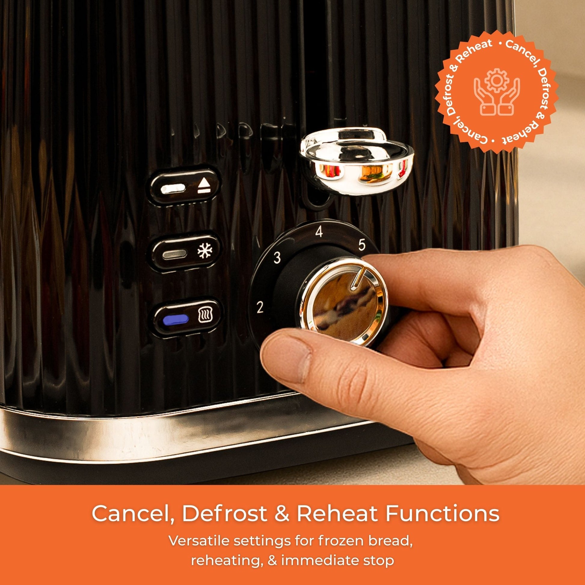 The defrost function toasts frozen bread perfectly, reheat warms previously toasted slices, and cancel stops the process immediately.