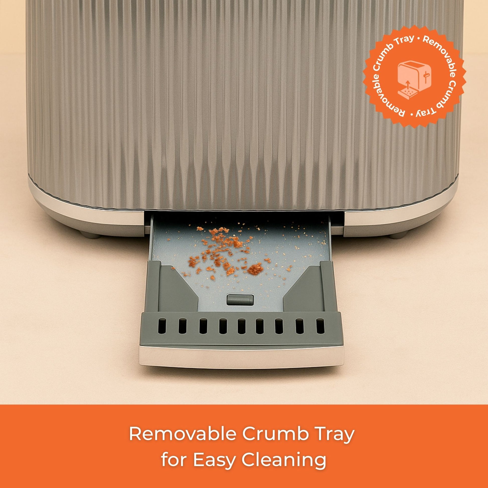 Use the removable crumb tray to collect crumbs easily. Slide it out, empty it, and clean it with mild detergent. Wipe the exterior with a soft, damp cloth.
