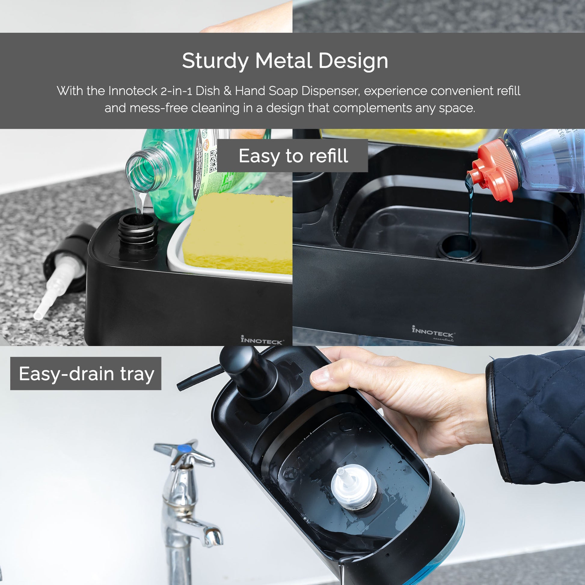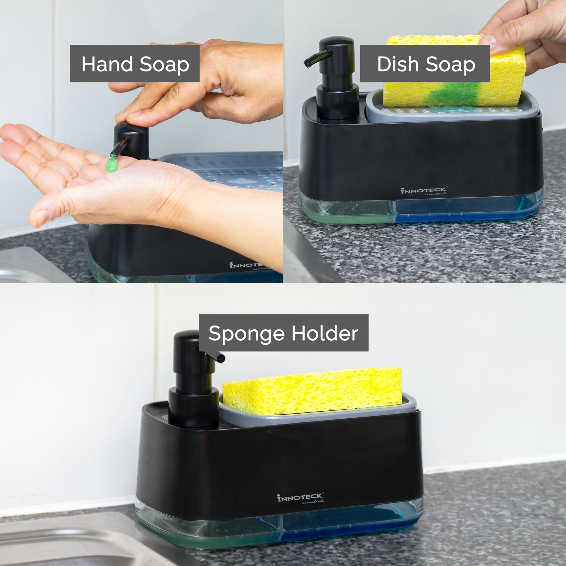 • 3-in-1 design for hand soap, dish soap, and sponge holder