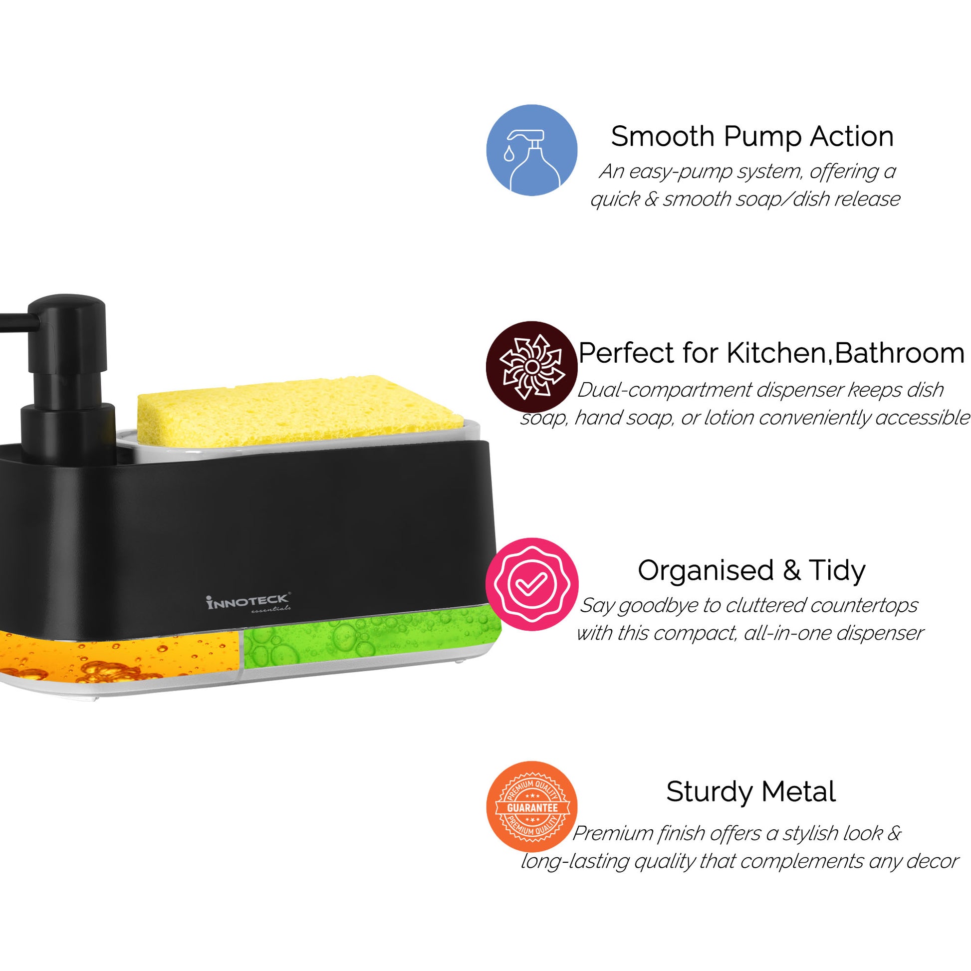 The Innoteck Essentials Soap Dispenser with Sponger Holder is a must have essentials for kitchen organisation. Designed to streamline your dishwashing routine, this compact 3-in-1 unit combines a soap and hand dispenser along with a sponge holder, making it the perfect kitchen gadget. With a simple press, it dispenses the perfect amount of soap, reducing waste and mess. Its sleek and modern design adds a touch of elegance to your kitchen accessories while enhancing functionality.