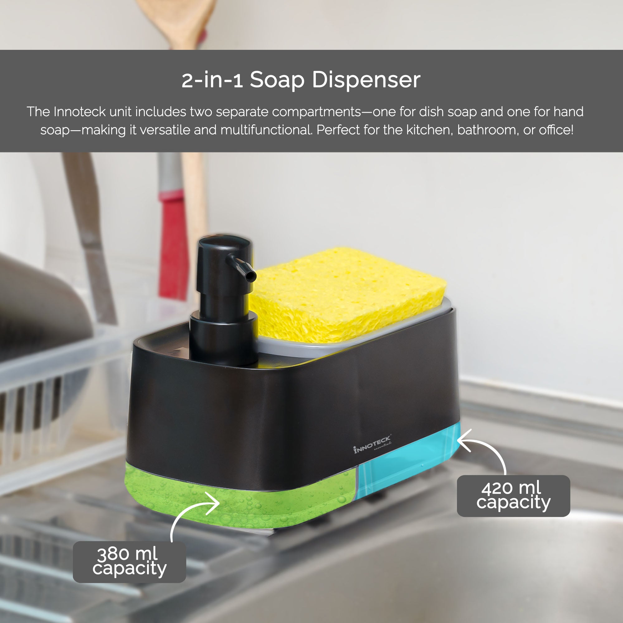 The 3-in-1 dispenser combines storage for hand soap, dish soap, and a built-in sponge holder, reducing counter clutter.