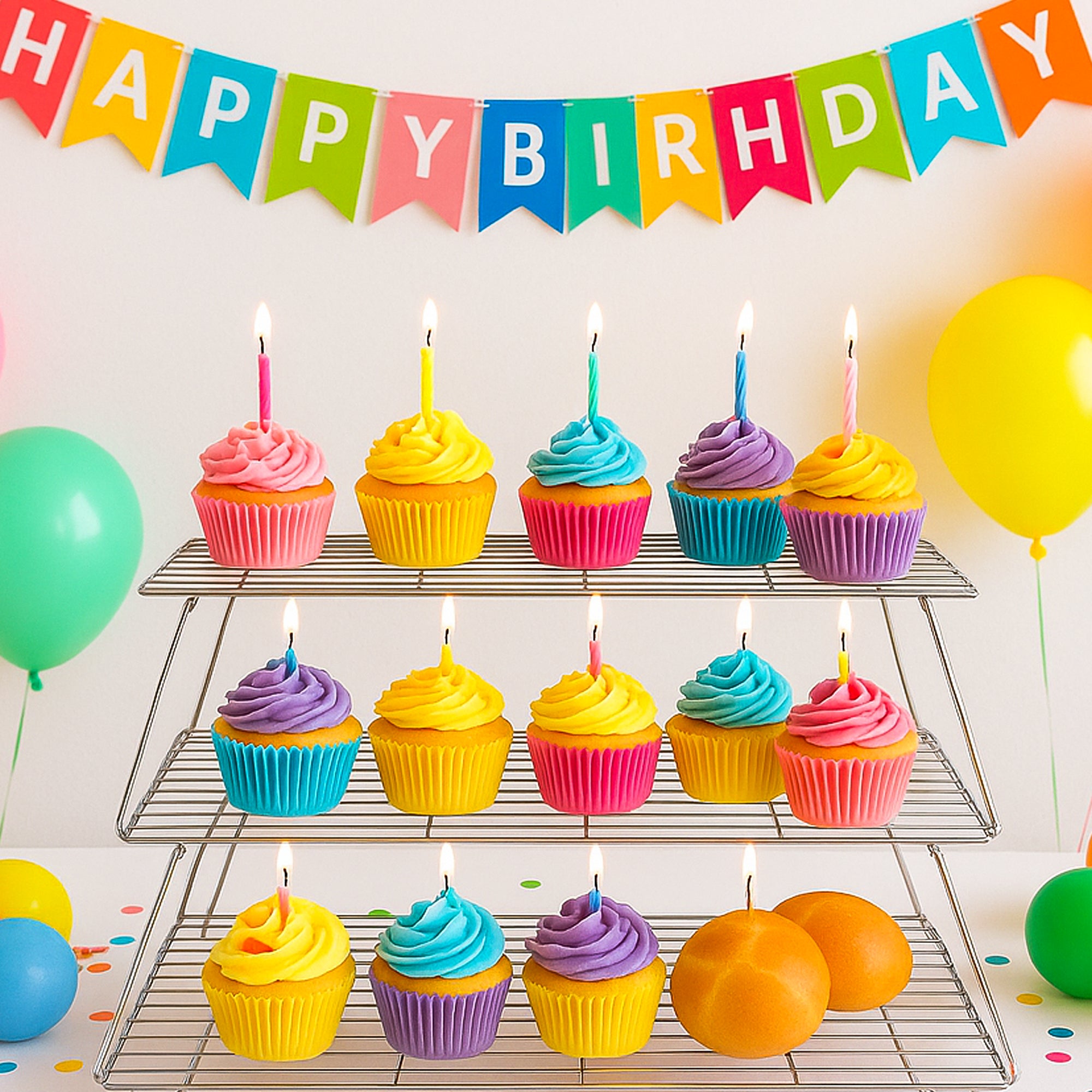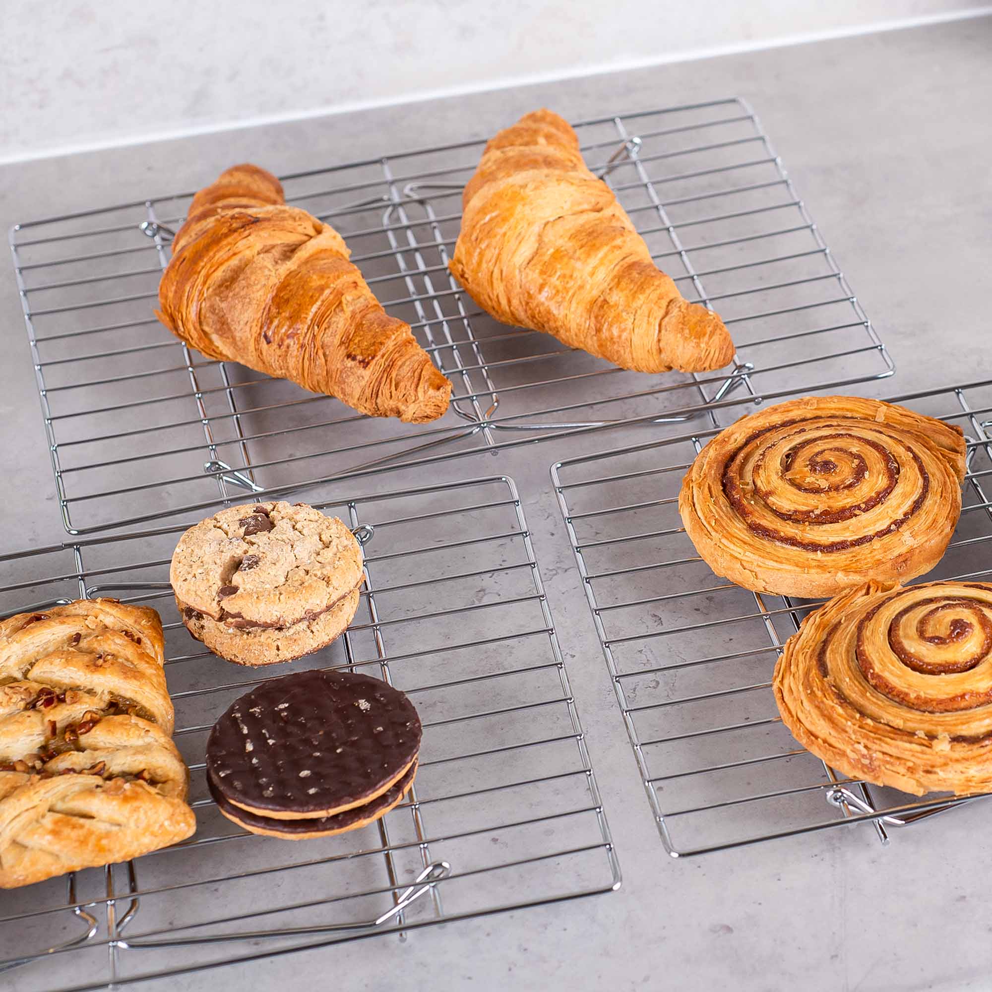 Once your baked goods have cooled, wipe the rack with a damp cloth or wash it with mild soap and water. Let it dry completely before folding the tiers flat for compact storage in a cupboard or drawer.