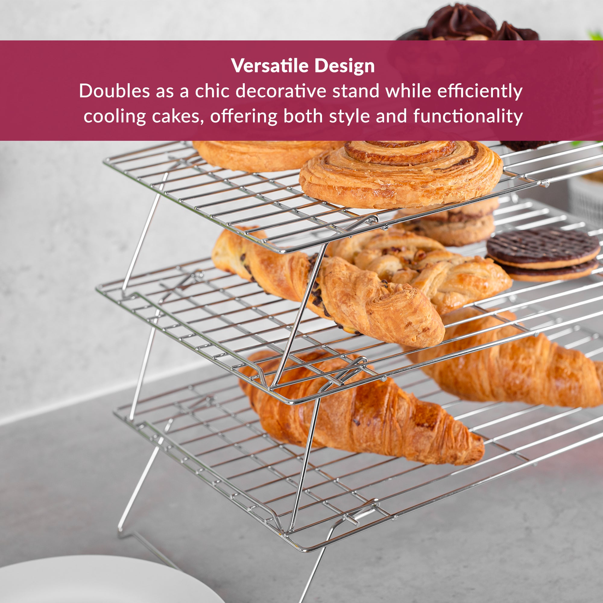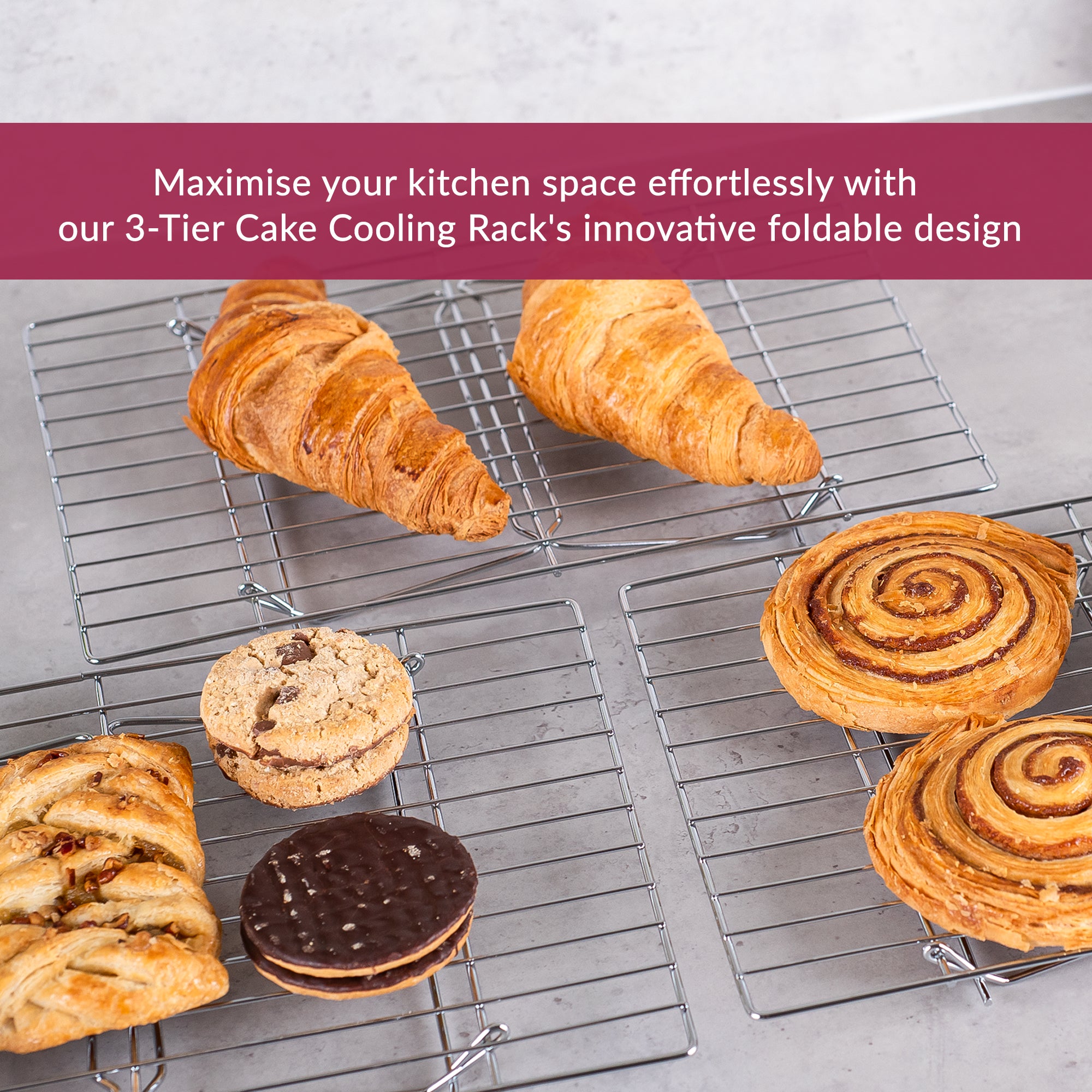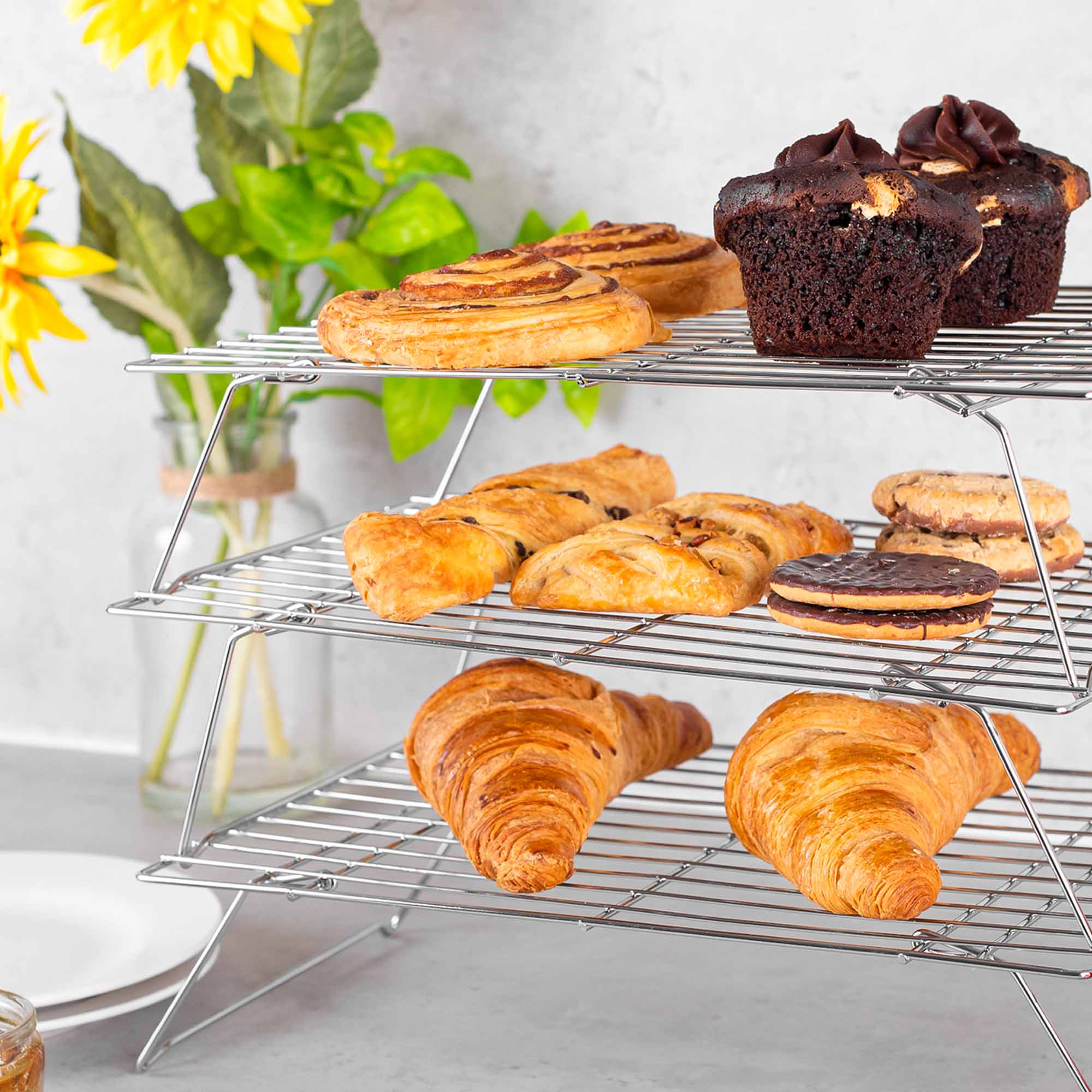 Unfold the 3-tier cooling rack fully and lock each tier securely in place. Ensure it is on a flat, stable surface to prevent any wobbling during use.