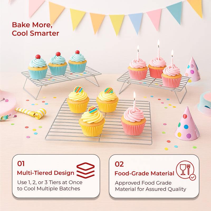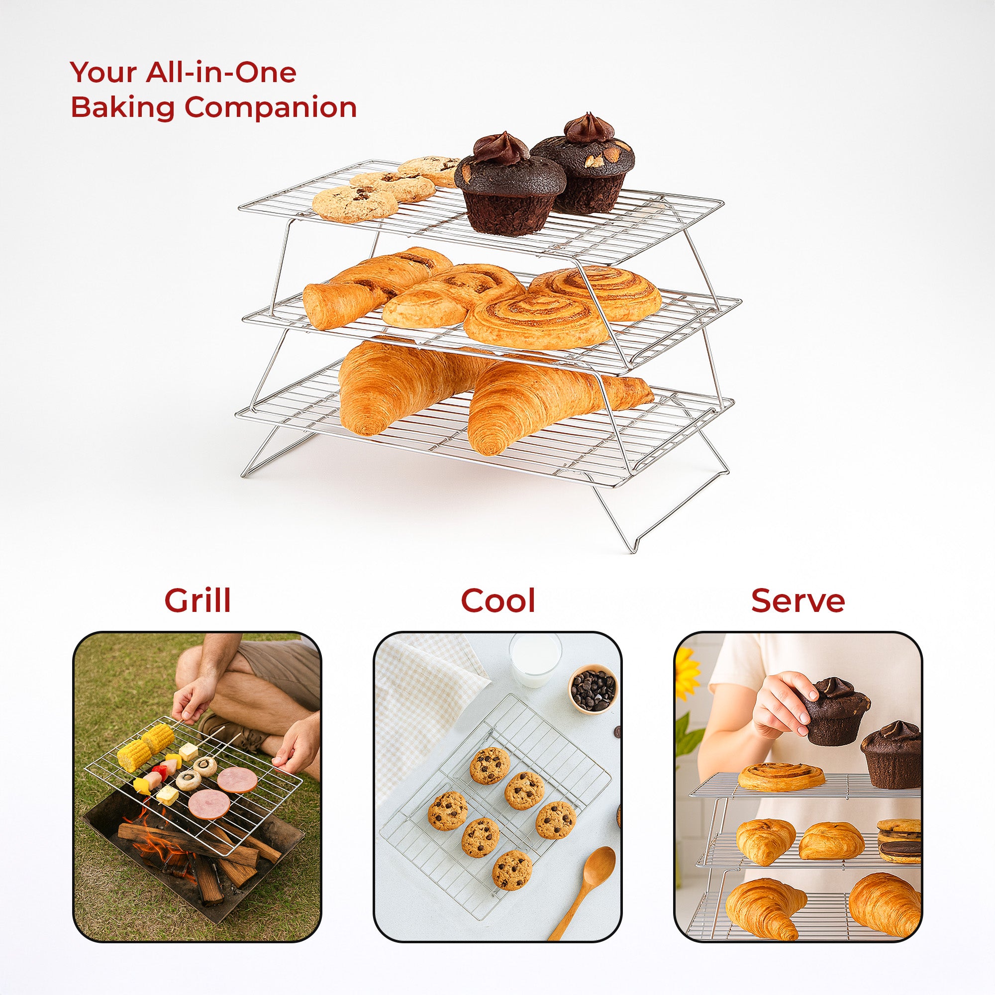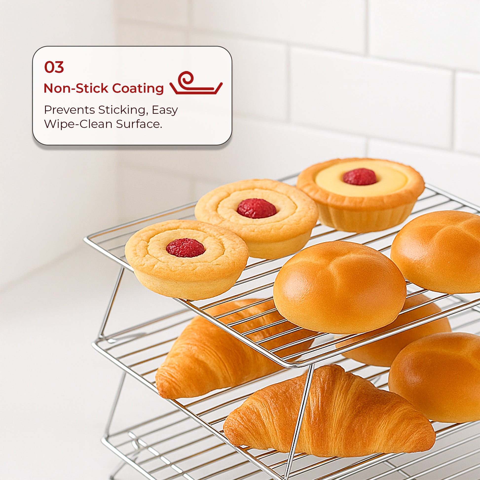 Unfold the 3-tier cooling rack fully and lock each tier securely in place. Ensure it is on a flat, stable surface to prevent any wobbling during use.
