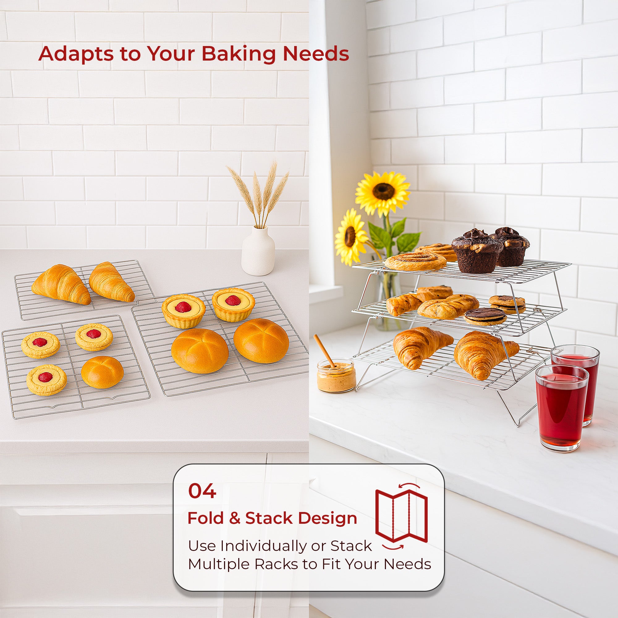 After removing your baked items from the oven, transfer them carefully onto the rack. Arrange them evenly on all tiers to allow maximum airflow for consistent cooling. Use the top tiers for lighter items like cookies and the bottom tier for heavier items such as cakes.