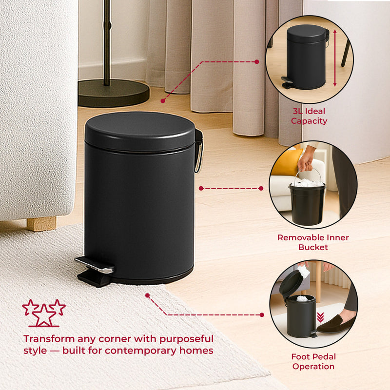 The 3L foot operated bin opens smoothly with a pedal press, allowing for hands-free and hygienic use.