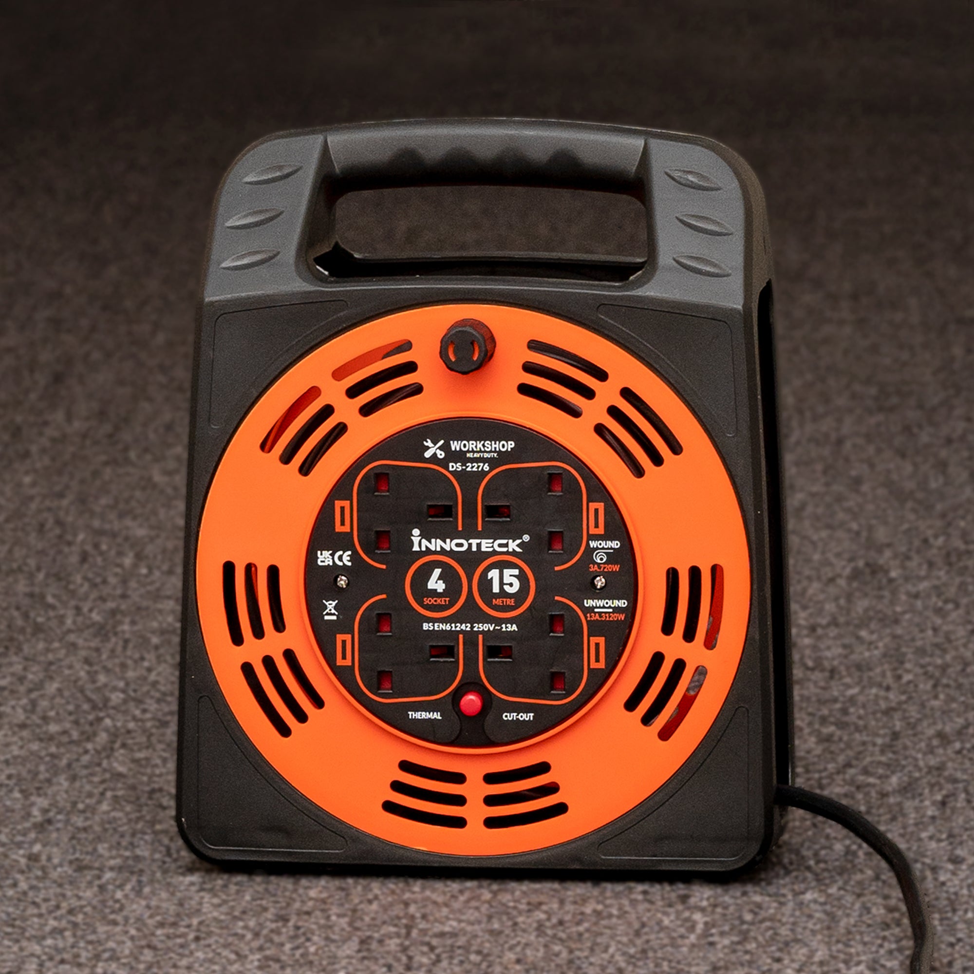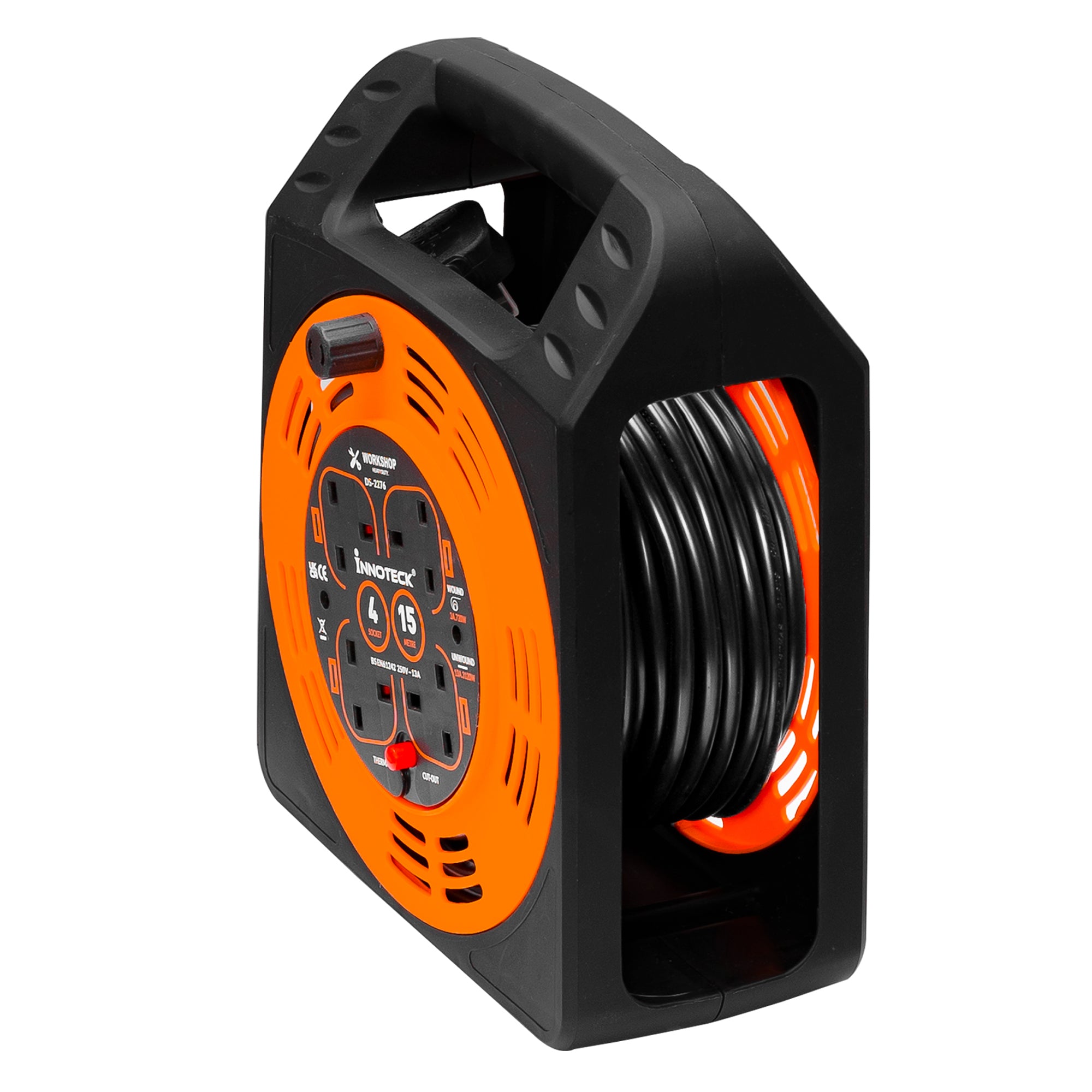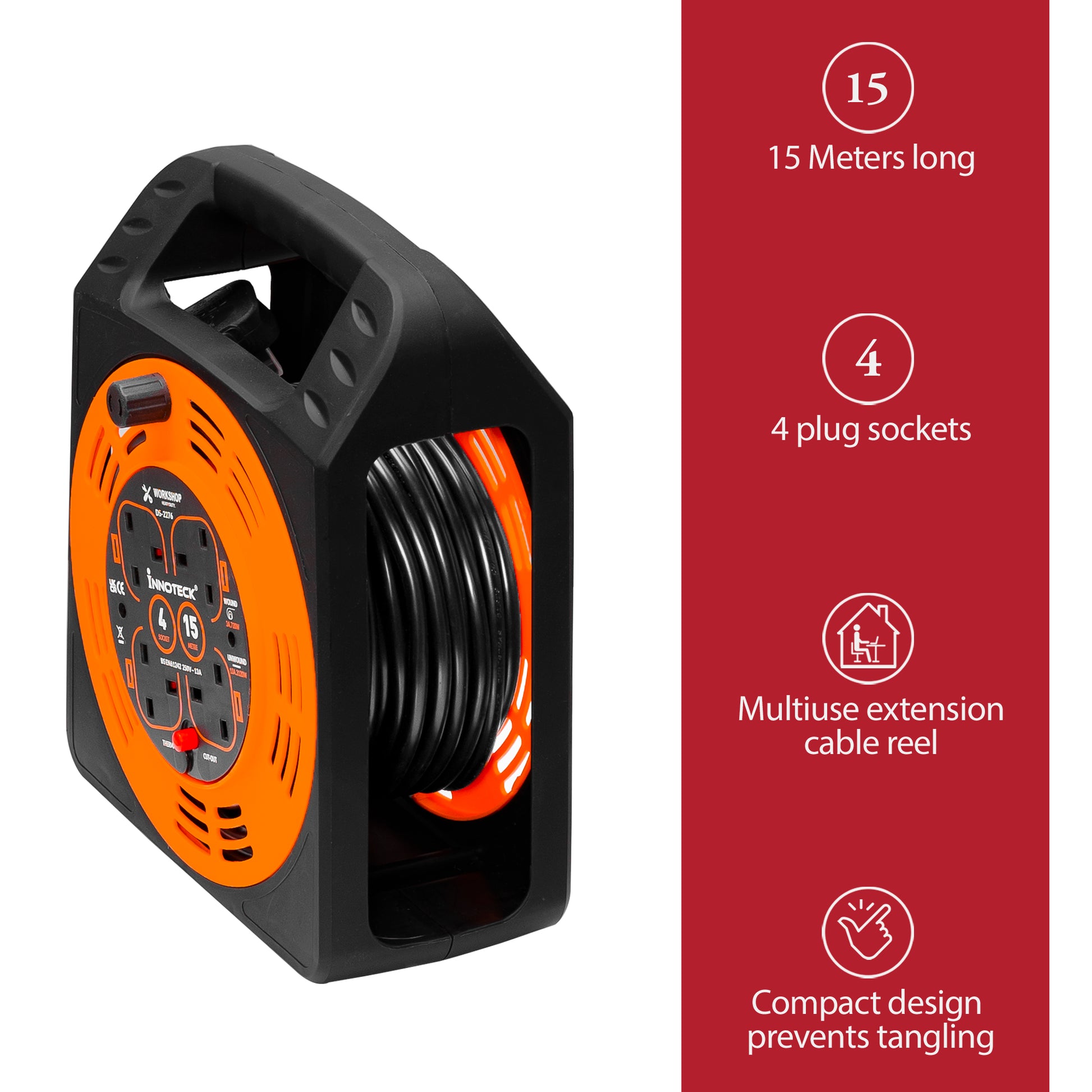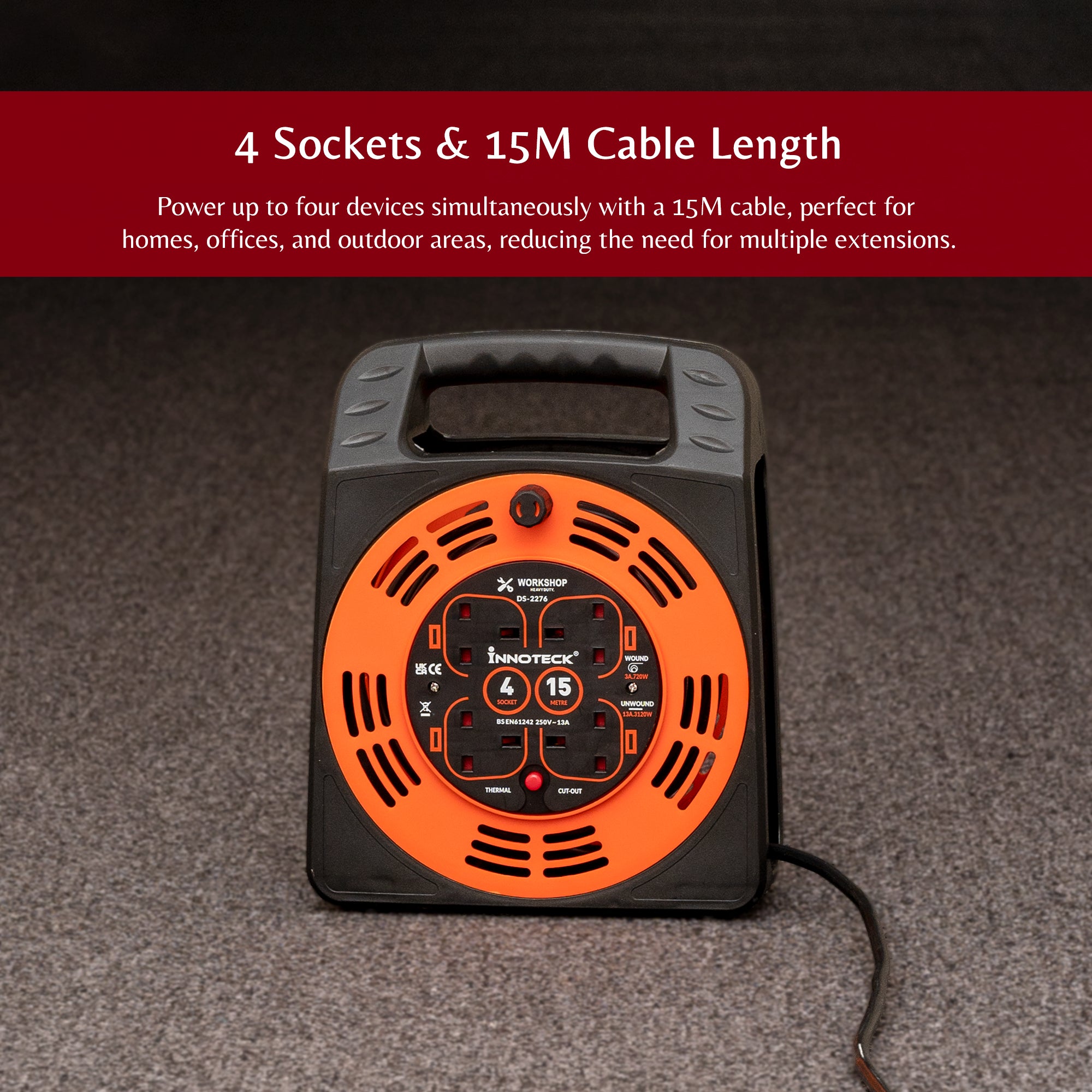 Perfect for DIY projects, outdoor setups, or on-site work, this heavy-duty 15m cable reel with 4 sockets offers reliable power delivery without compromising safety or style.