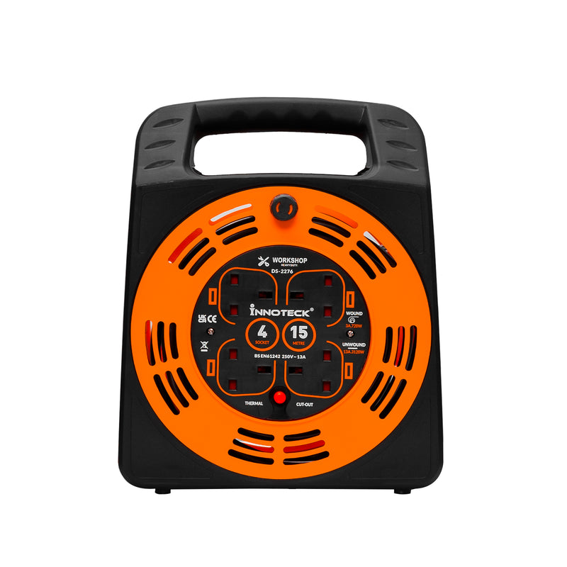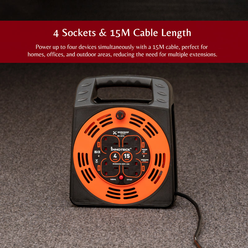 Yes, the Innoteck 4-way 15m cable reel is suitable for both indoor and outdoor use. Its heavy-duty build and high-visibility colour make it ideal for gardens, garages, workshops, and on-site tasks. However, avoid leaving it in wet conditions or direct rain for safety.