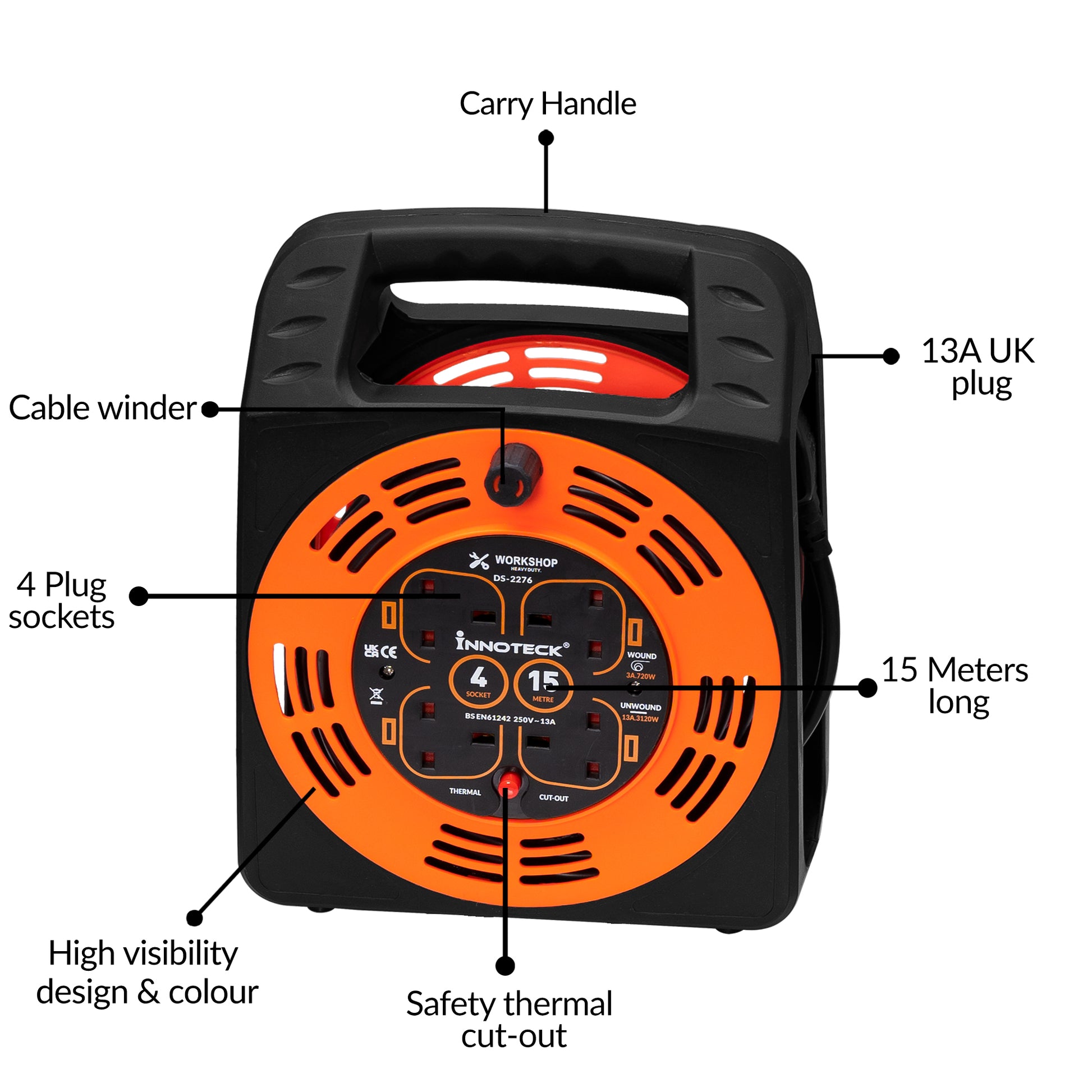 Stay powered and protected wherever you go with the Innoteck 4-Way 15M 13A Cable Reel – the perfect companion for both home and professional use.