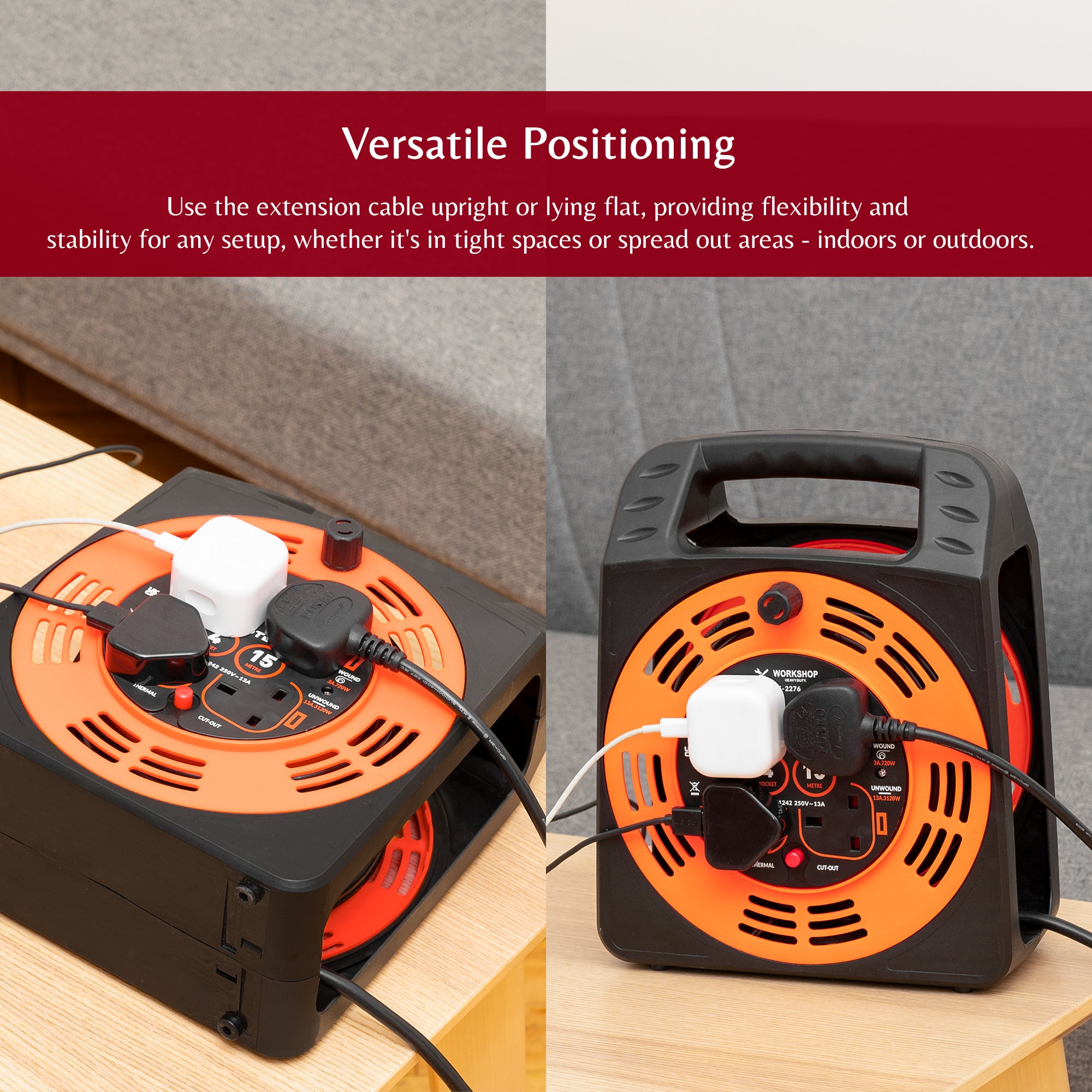 This 4 way 15 metres cable reel allows you to use multiple devices at the same time, with complete safety. With 15 metres of cord length, you can take your devices quite far.
