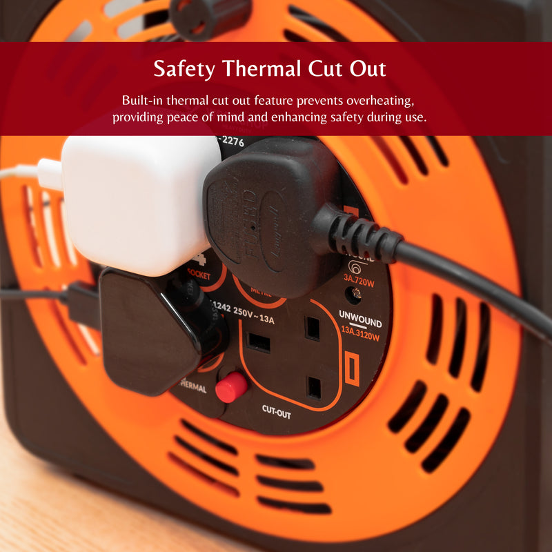 The thermal cut-out automatically disconnects power if the reel overheats, preventing potential damage or accidents. Once it cools down, you can simply press the reset switch to resume operation safely.