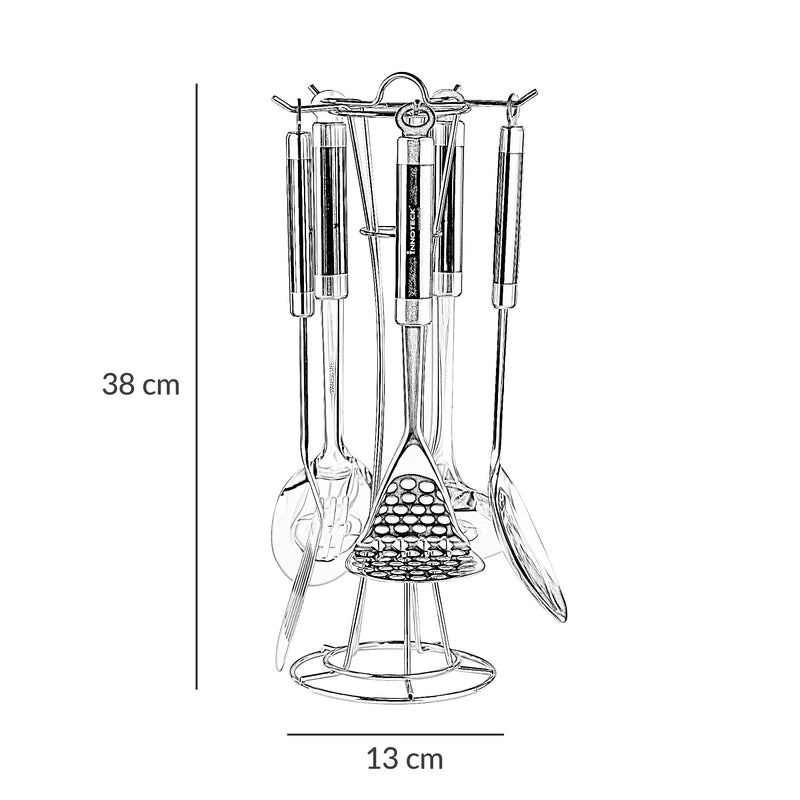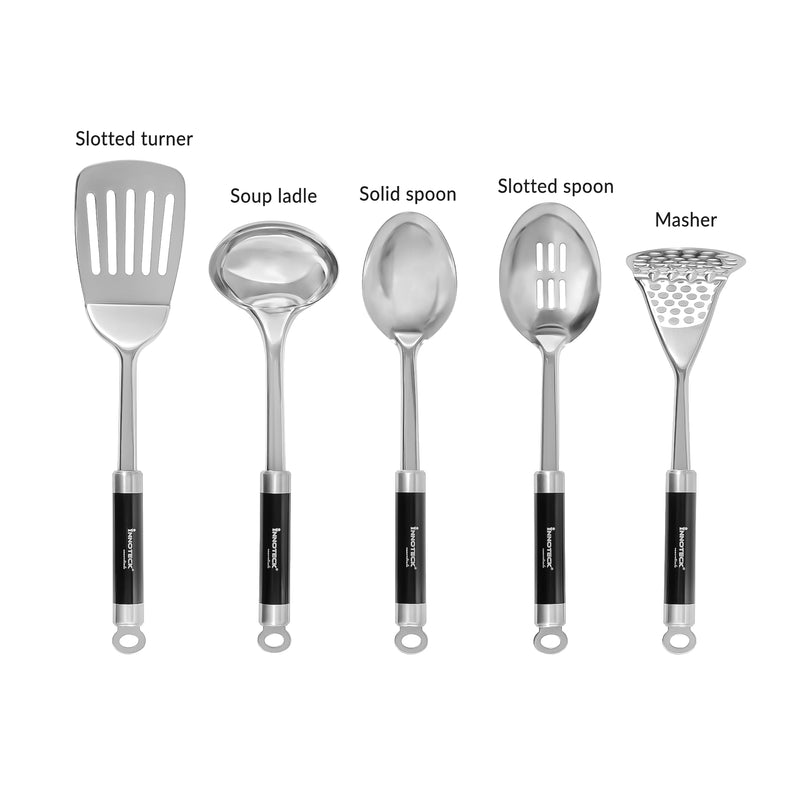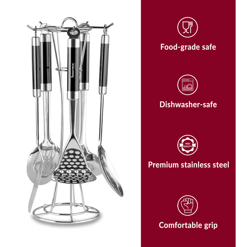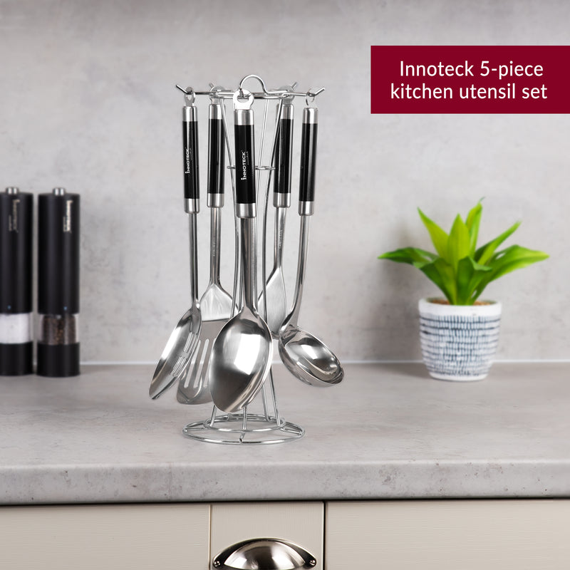The set includes five stainless steel utensils – a spoon, slotted spoon, turner, ladle, and pasta server – along with a matching wire stand.