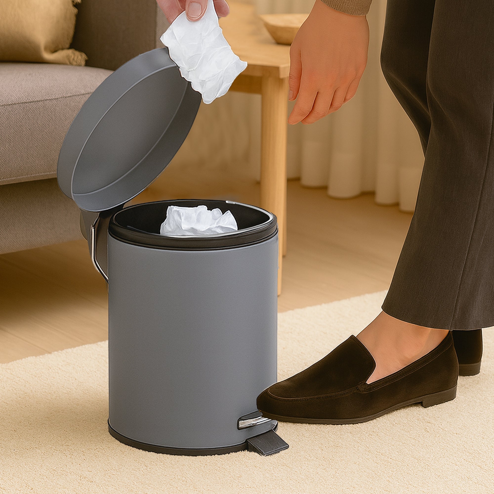 The 5L foot operated bin opens smoothly with a pedal press, allowing for hands-free and hygienic use.