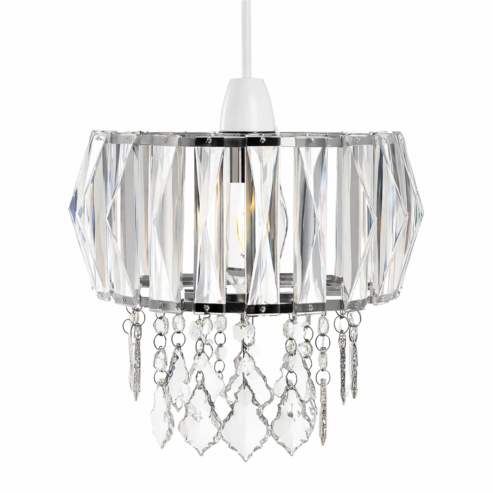 It is a durable acrylic lampshade featuring crystal-style droplets that offer elegance without the fragility of glass.