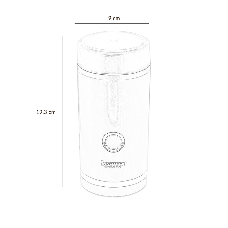 Unscrew the lid counterclockwise. Add your desired amount of coffee beans. Make sure it's at least 7 grams (1 tablespoon) but no more than 70 grams (8 tablespoons). Place the lid on the grinder and secure it. Press and hold the on/off button. If coffee grounds build up on the edges, stop grinding and gently shake the grinder. The grind fineness depends on the amount of beans and grinding time. Refer to the provided chart for recommendations. Keep grinding sessions under 30 seconds to prevent overheating and flavor loss. After grinding, remove the lid and pour out the grounds. For optimal flavor, grind beans immediately before brewing.