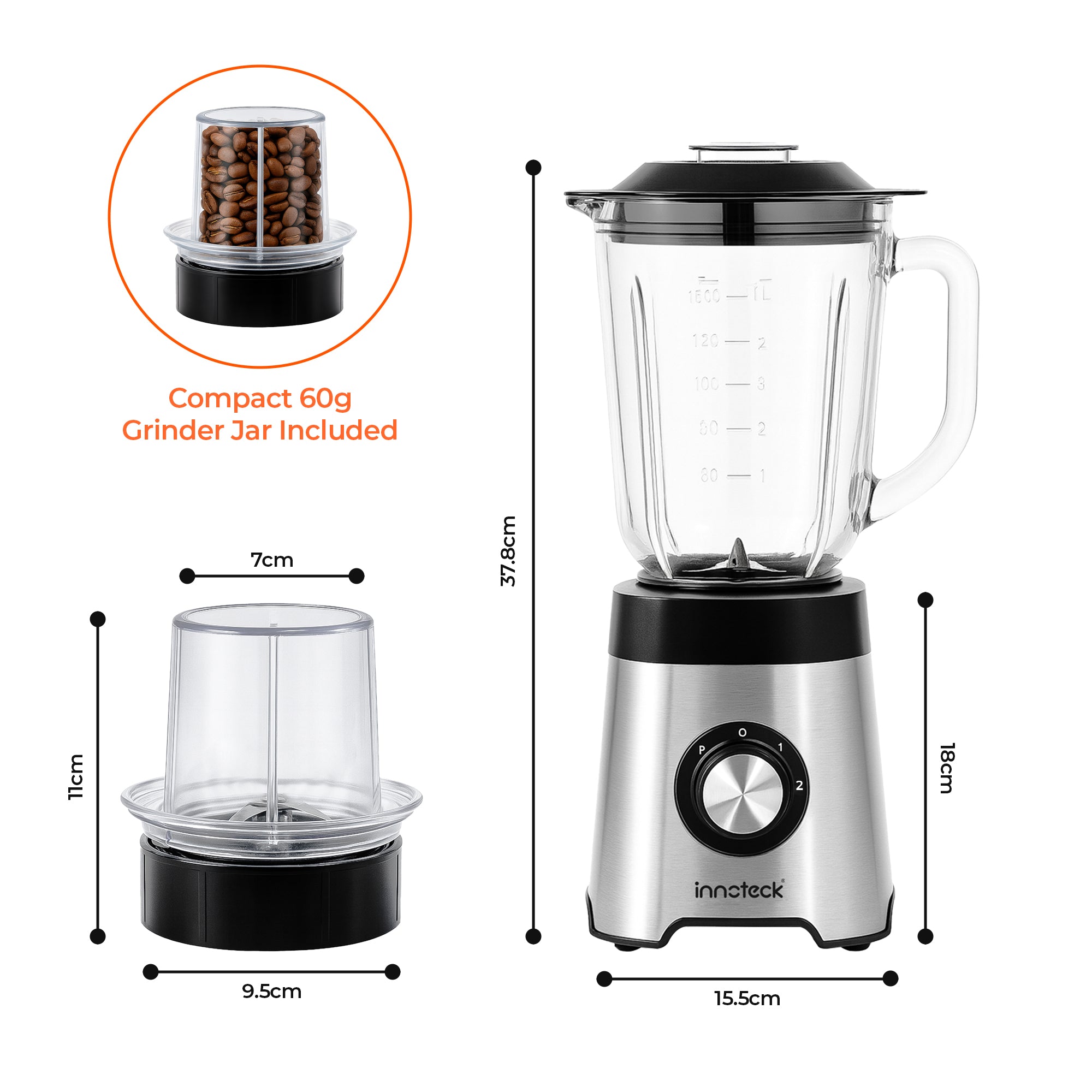 The grinder is perfect for coffee beans, spices, herbs, and nuts, turning the appliance into a versatile multi-function glass blender for both wet and dry ingredients.