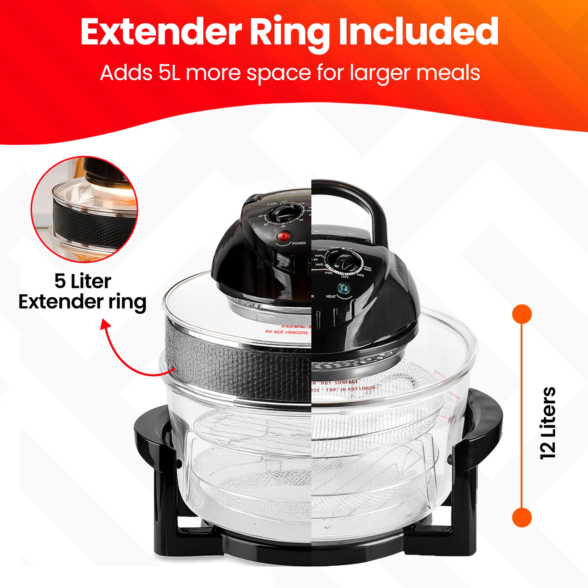 Place food directly on the wire rack for roasting and thawing. Place food on a metal or ceramic baking pan for baking. Wrap vegetables in foil with water and place them at the bottom of the cooking bowl for steaming. Use the extender ring to increase the capacity from 12L to 17L. Choose a preset and adjust time/temperature as needed and adjust settings during the cooking process. Until you are familiar, check food regularly to ensure it's cooked to your liking. Once the air fryer beeps, let the food cool for a short while before using the oven mitts to take it out. Serve hot and enjoy your meal!