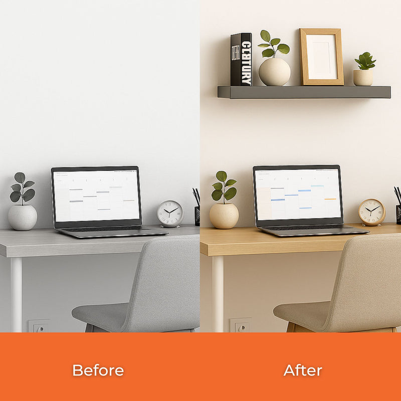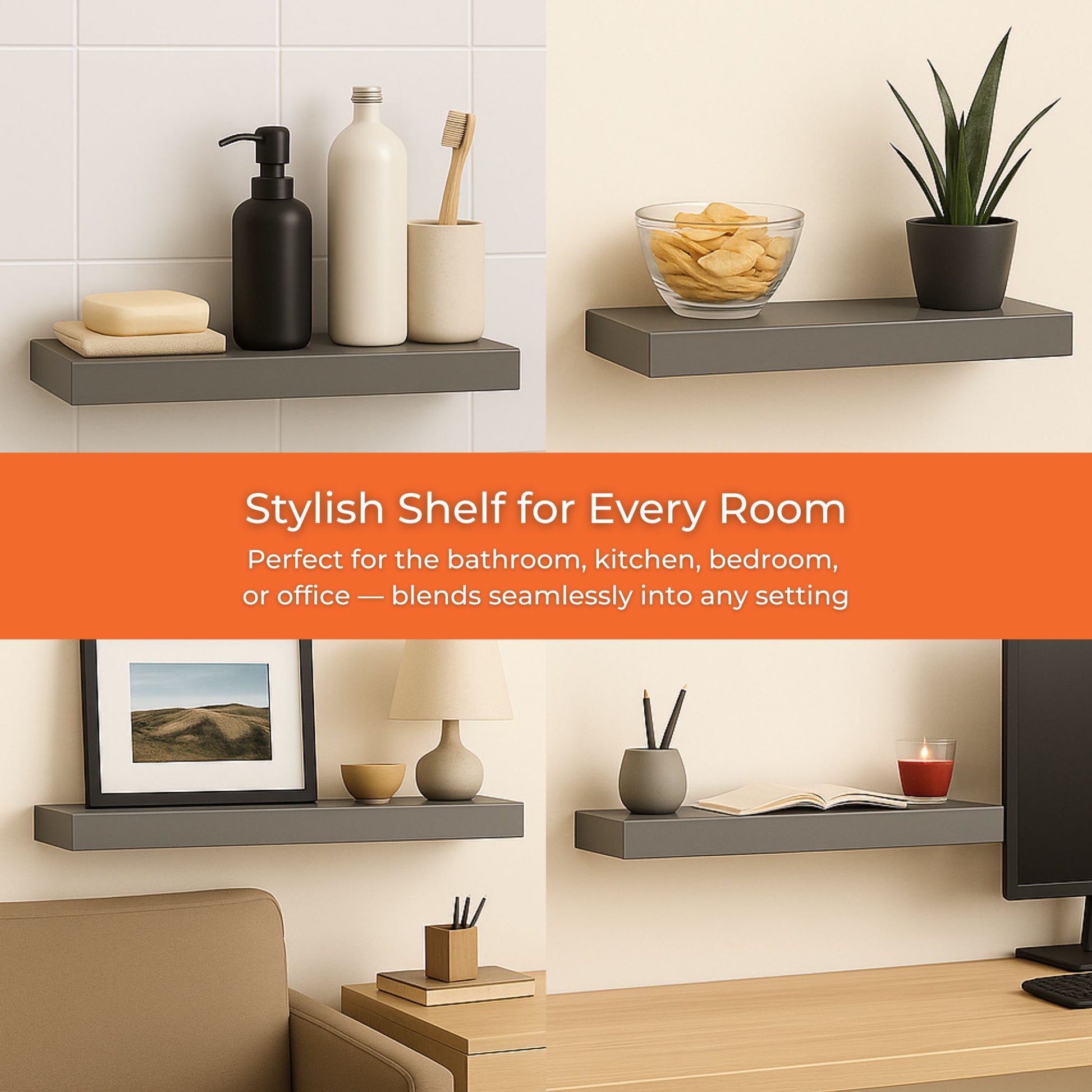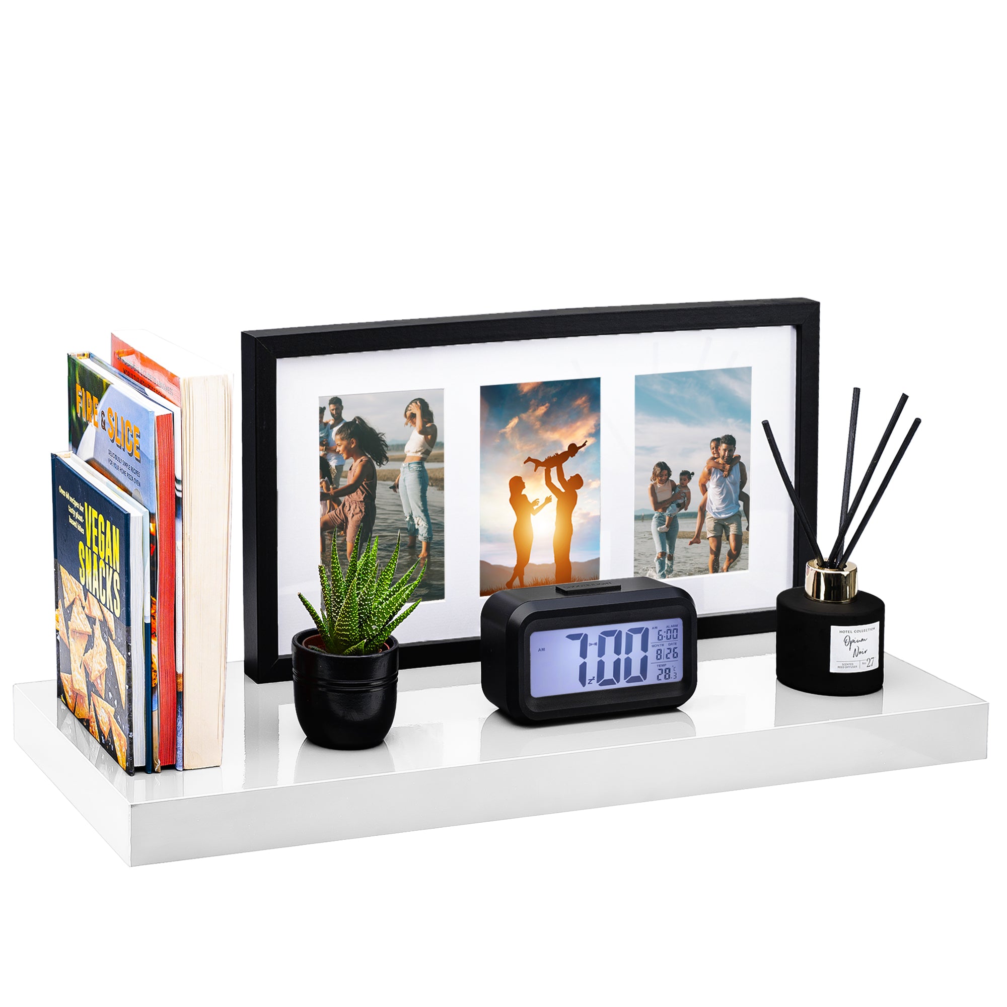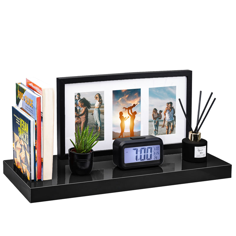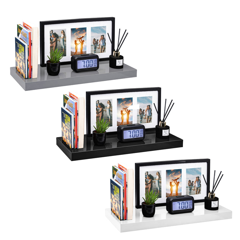 Arrange lightweight items such as books, plants, or décor pieces on the shelves. For upkeep, wipe the shelves with a damp cloth to maintain their glossy finish. Avoid overloading to ensure longevity and stability.