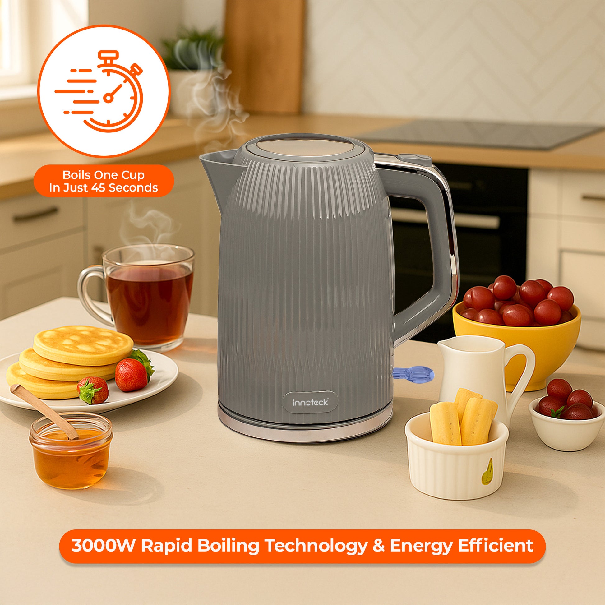 The 1.7L electric kettle boils water in minutes, so you can enjoy tea, coffee, or soups without waiting too long.