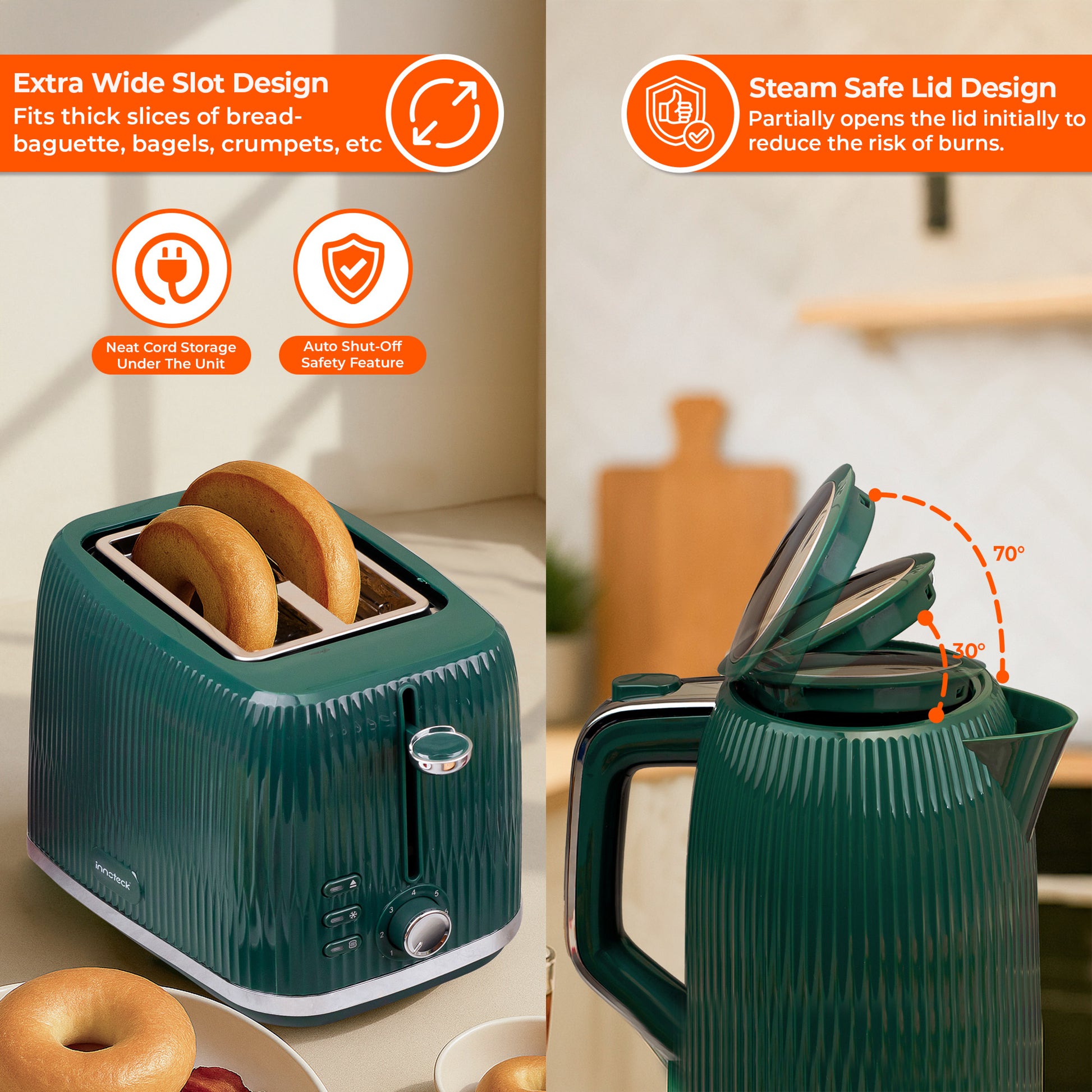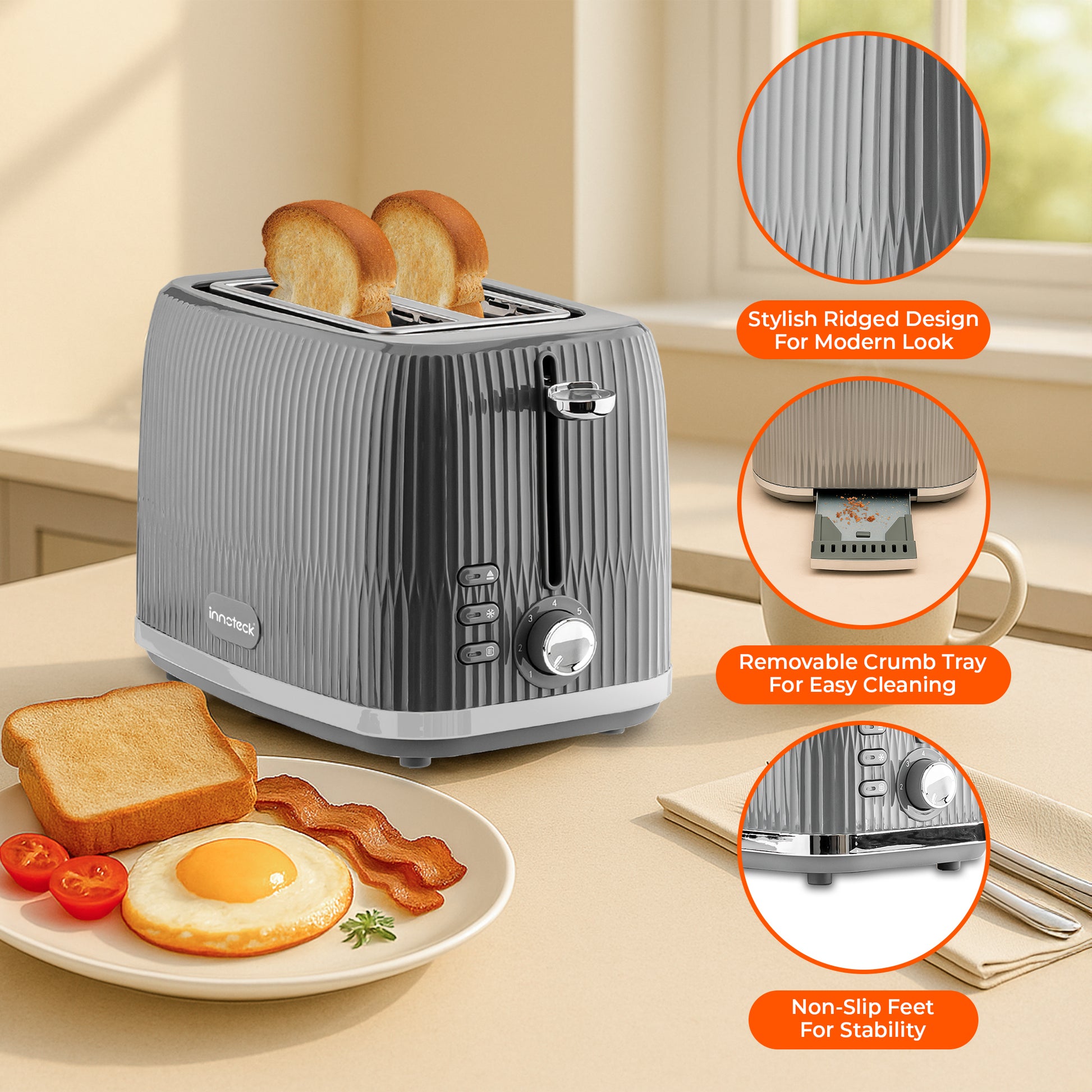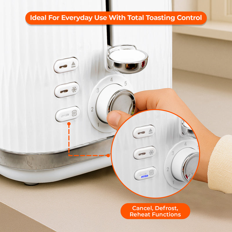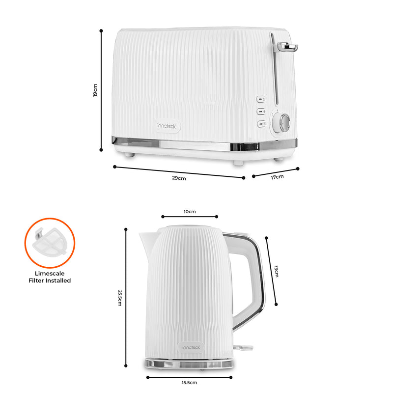 Our toaster comes with a removable crumb tray that wipes clean easily, and the kettle’s removable filter makes tidying up simple.