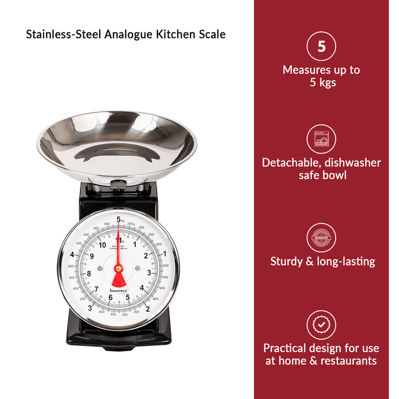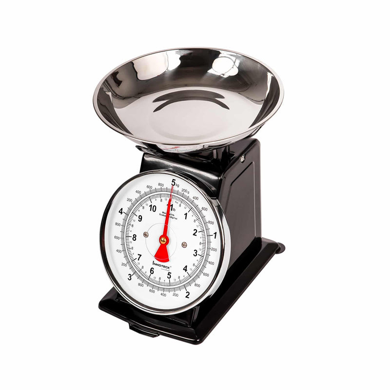 This mechanical kitchen scale has a maximum capacity of 5 kilograms (or 11 lbs). This makes it suitable for everything from light spices to heavier ingredients like flour or fruit.
