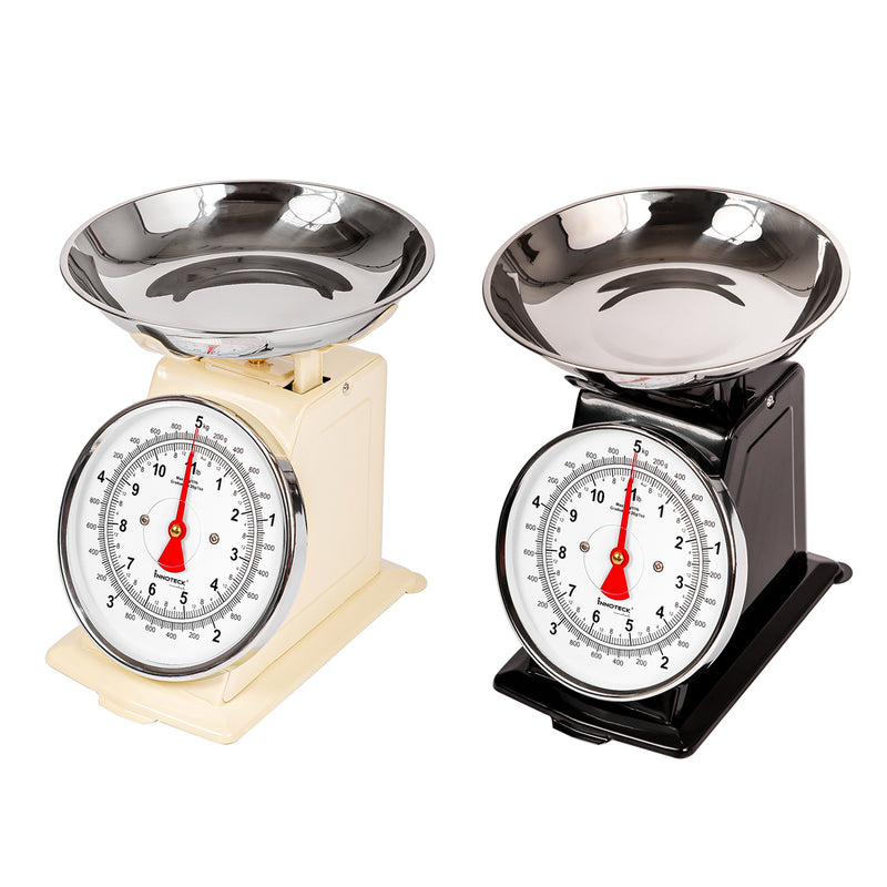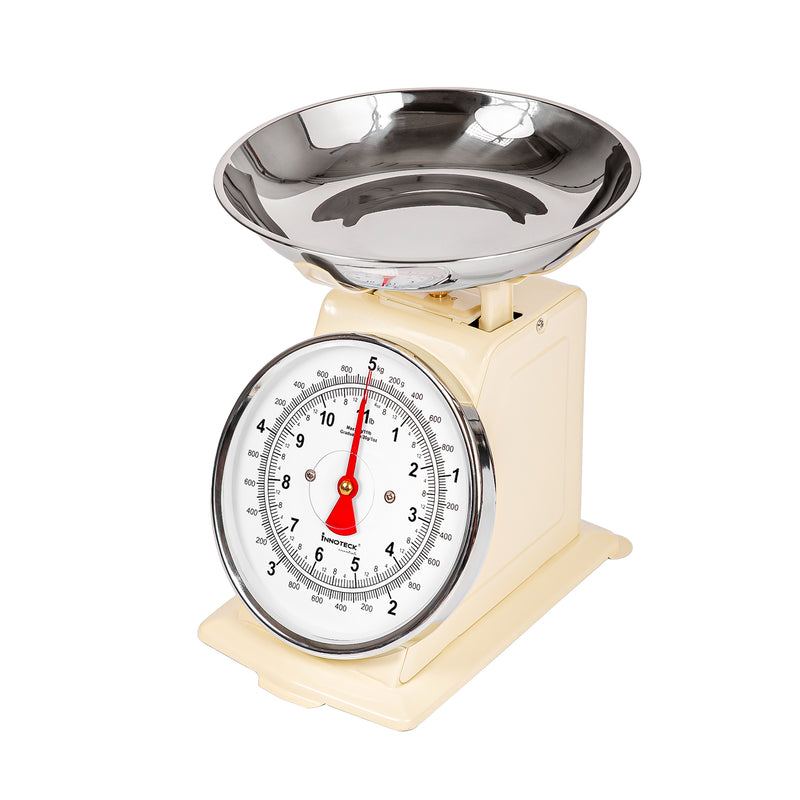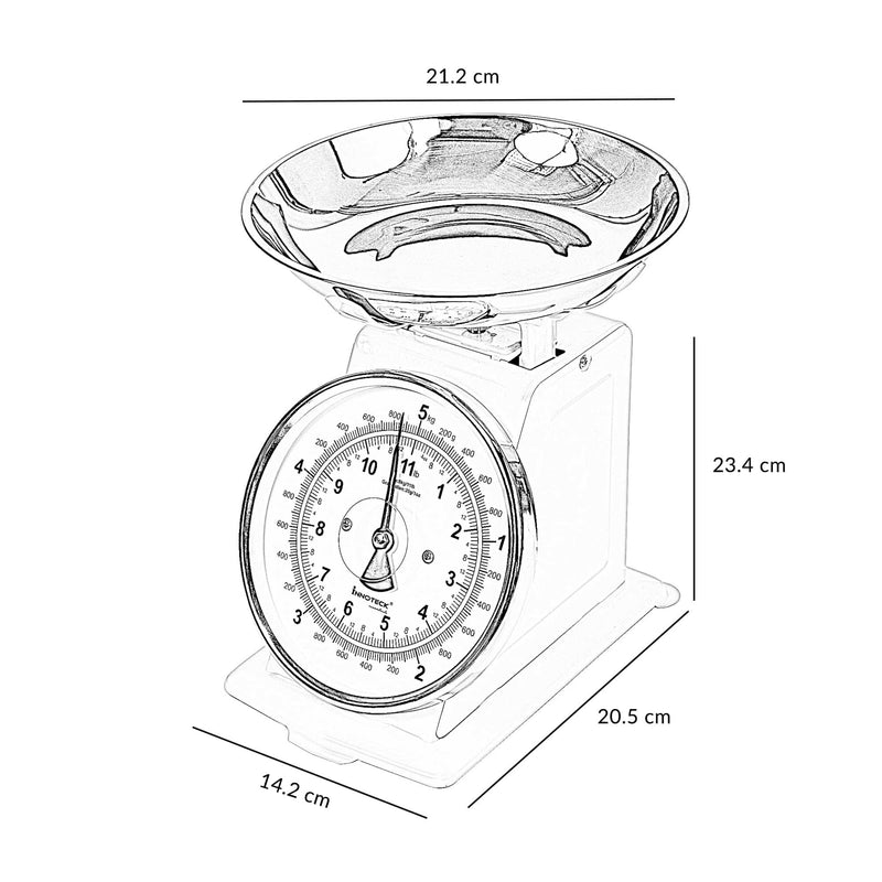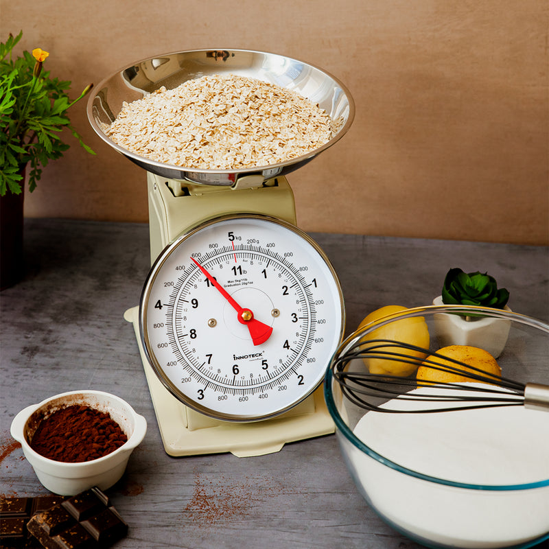 To measure ingredients, start by turning the dial to zero (tare) after placing an empty bowl or container on the scale. Gradually add your ingredients to the bowl until you reach the desired weight, as shown on the easy-to-read dial. With a maximum capacity of 5 kg, the scale is perfect for measuring everything from small quantities of spices to larger portions of flour, sugar, or produce.