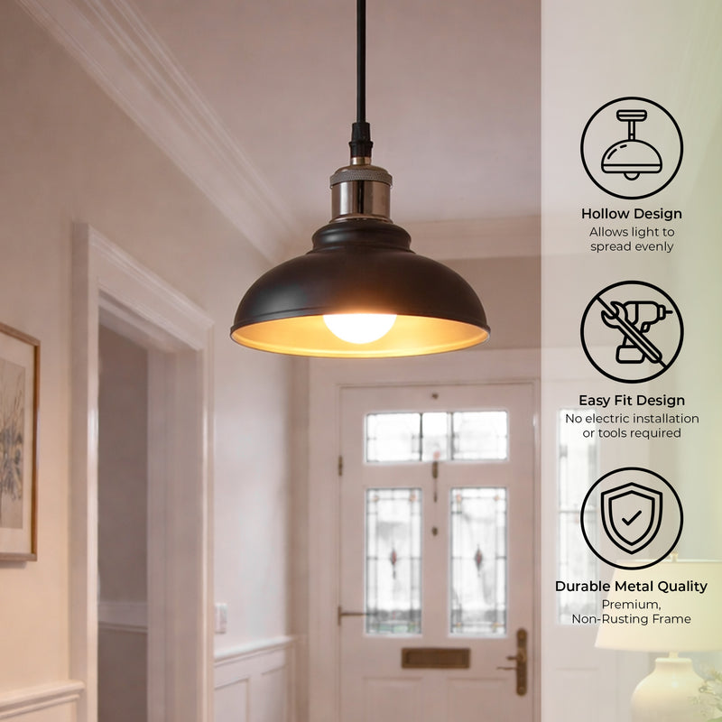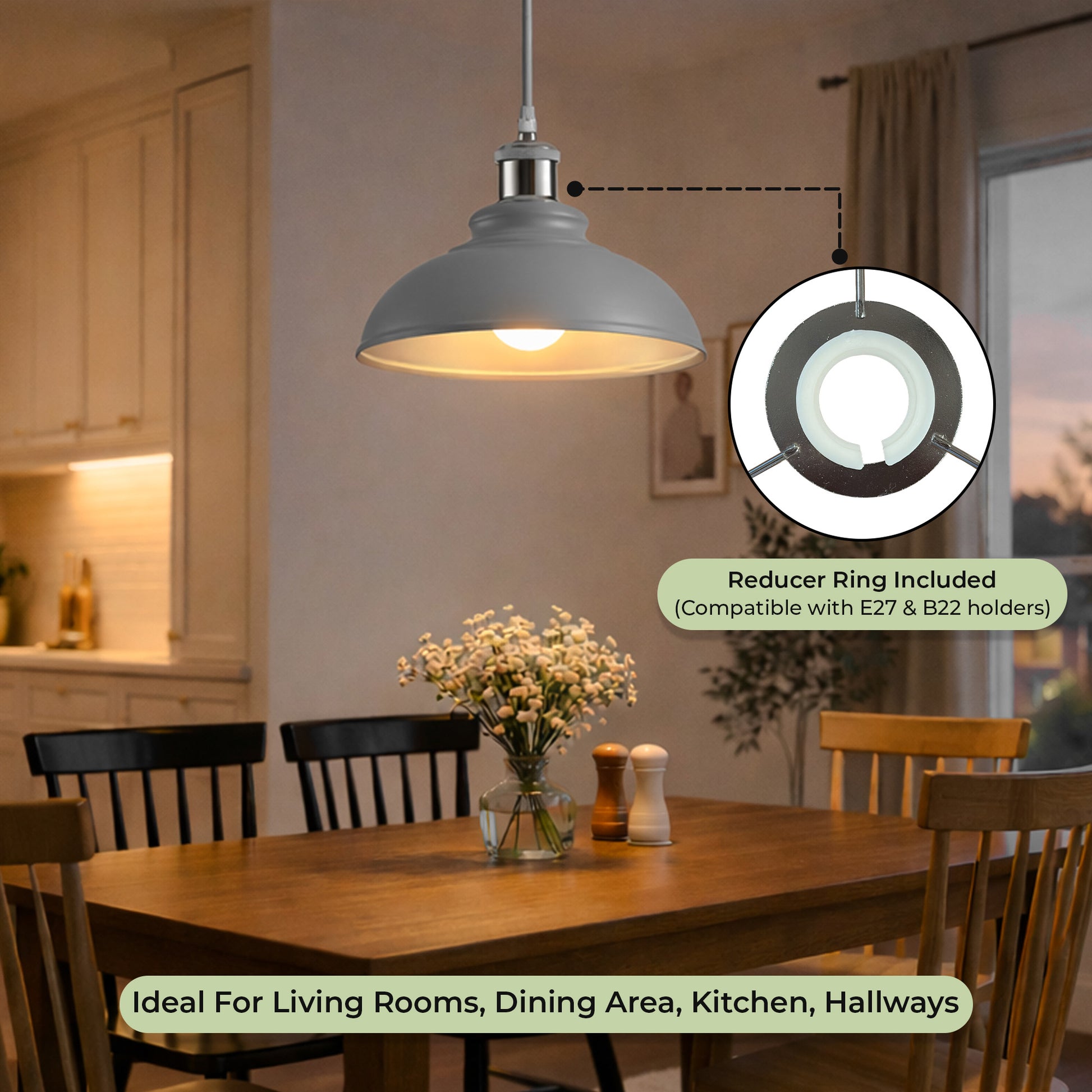 This metal ceiling lampshade is compatible with both E27 and E14 lamp holders using the included ring adapter.