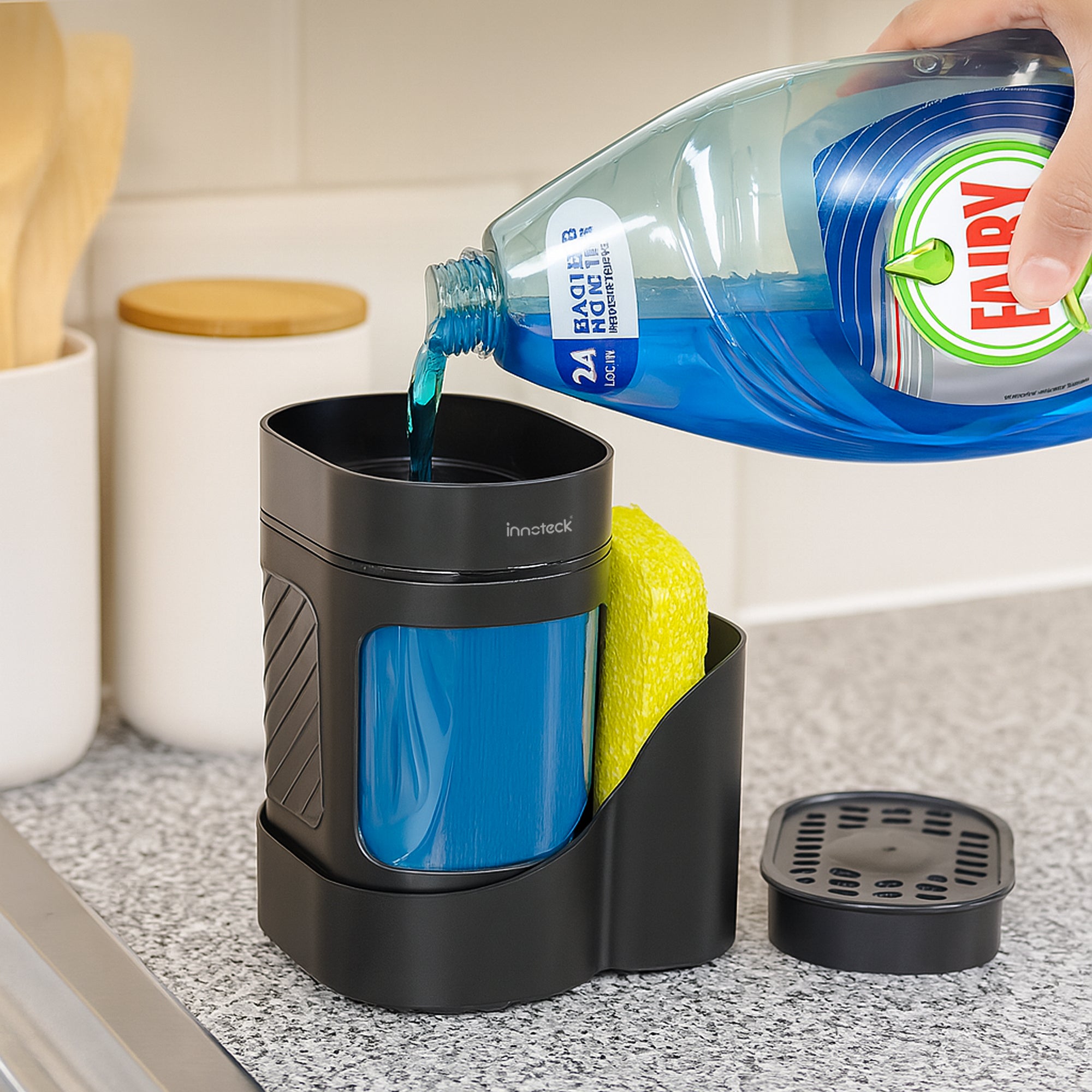 Open the compartments and carefully pour the hand soap and dishwashing detergent into their respective sections. Ensure the lids are tightly closed to avoid spills.