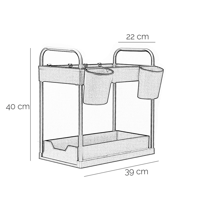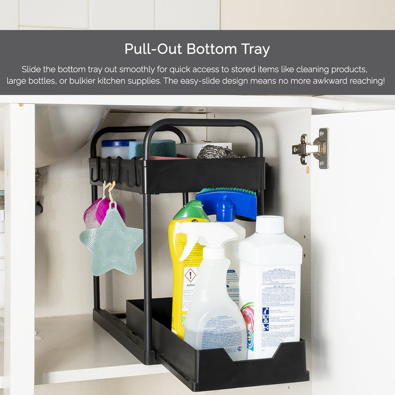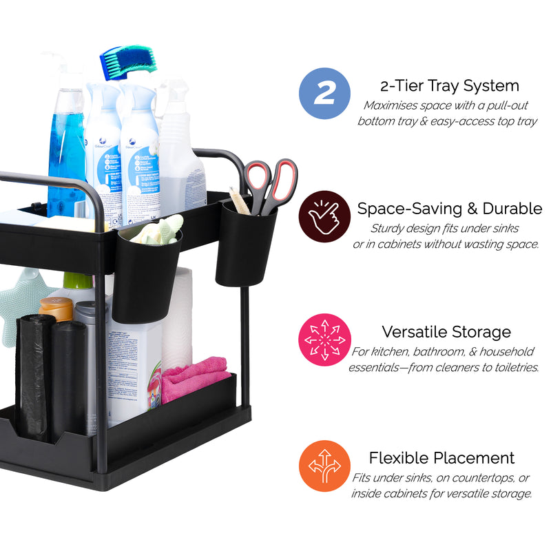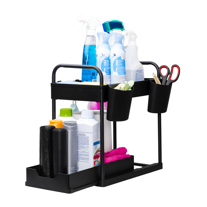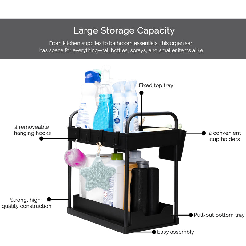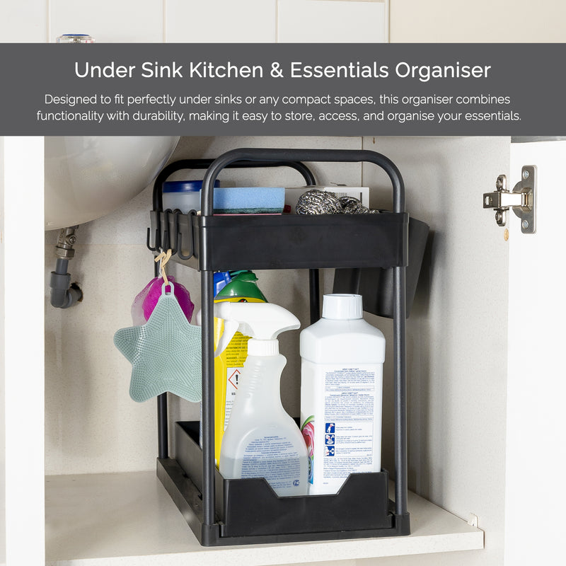 Place the organiser under the sink, ensuring it fits without obstructing pipes or plumbing fixtures. Use the pull-out bottom tray for frequently accessed items like cleaning sprays, sponges, or cloths, and the top tray for less-used supplies such as extra toiletries or bulk cleaning products. Take advantage of additional features like hooks or compartments for hanging smaller tools or accessories.