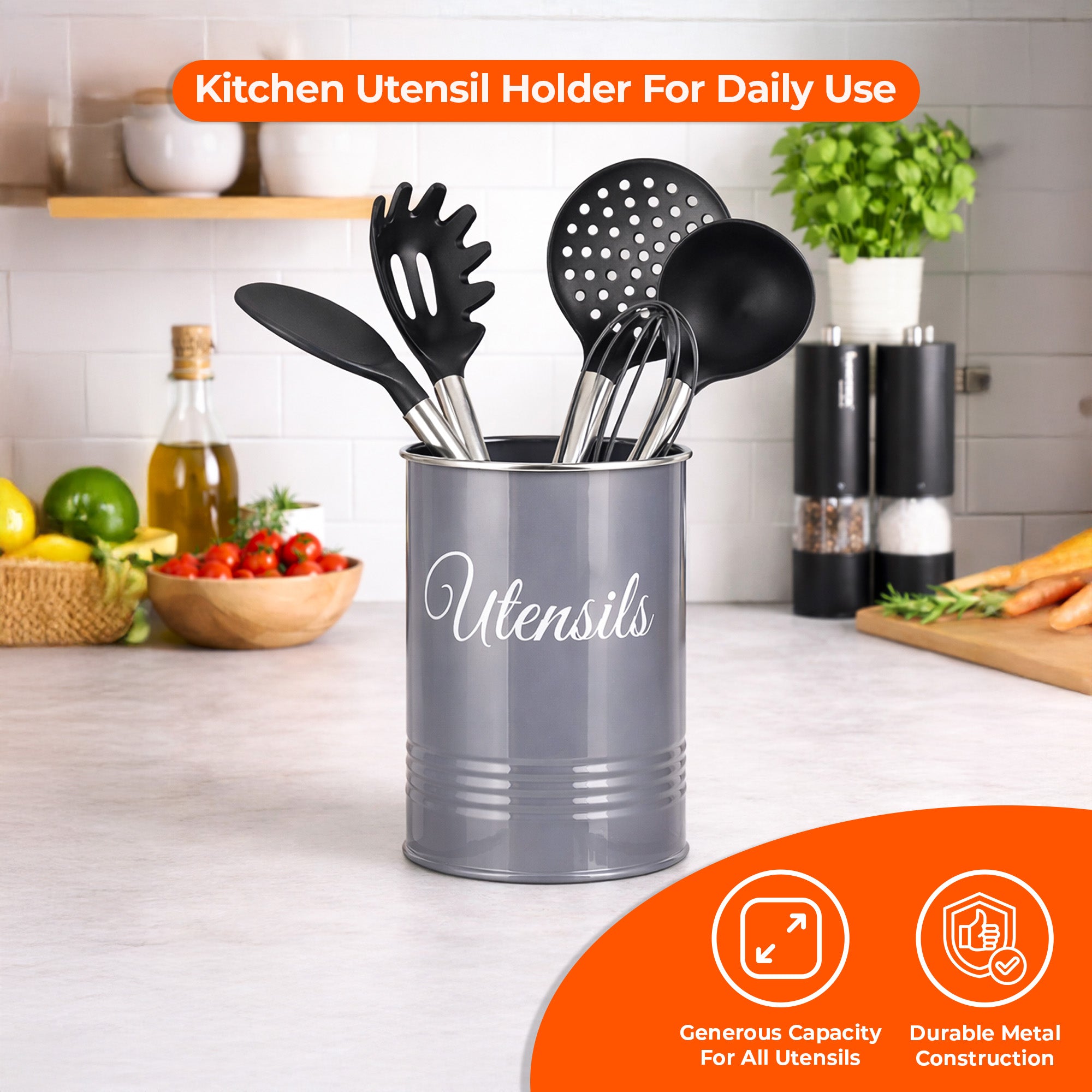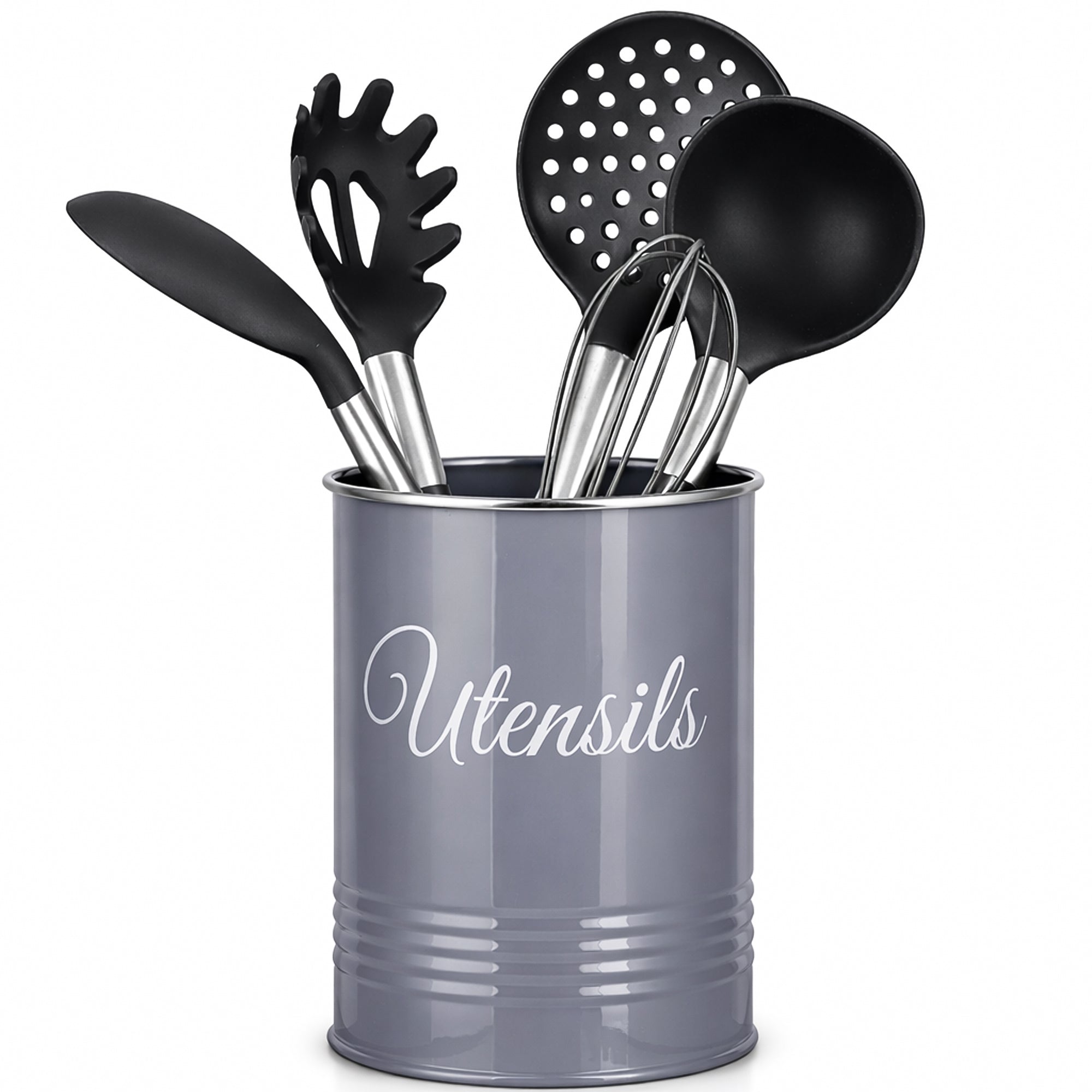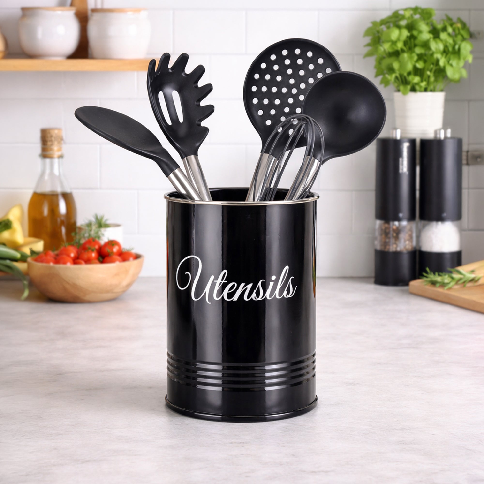 It is a durable metal utensil holder with a high-gloss finish for everyday kitchen use.