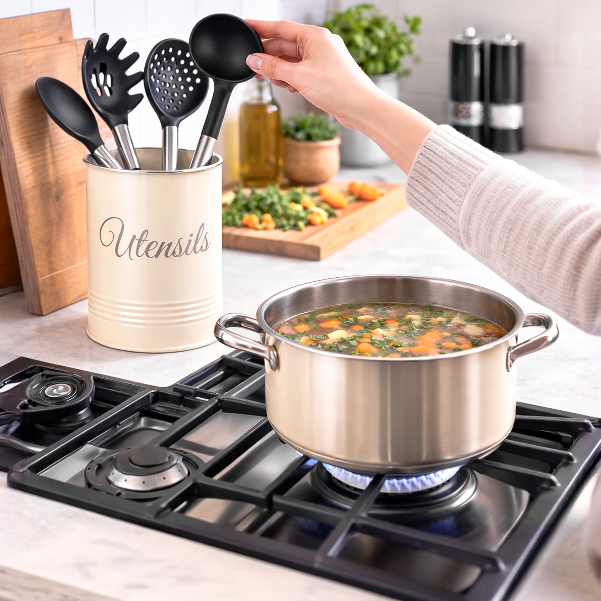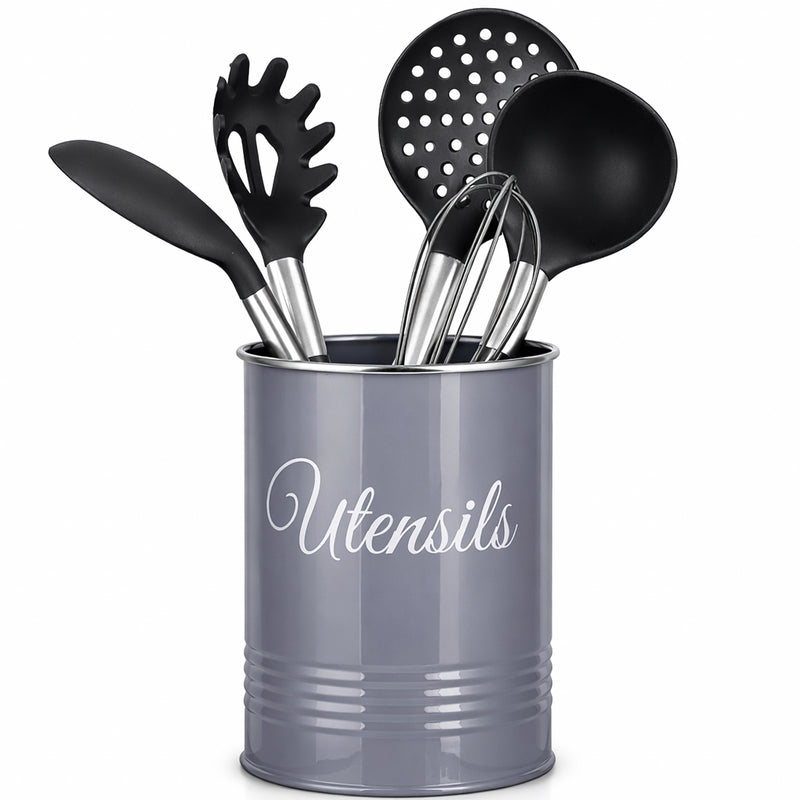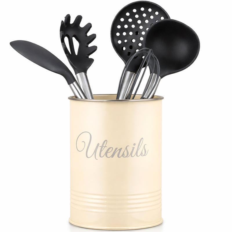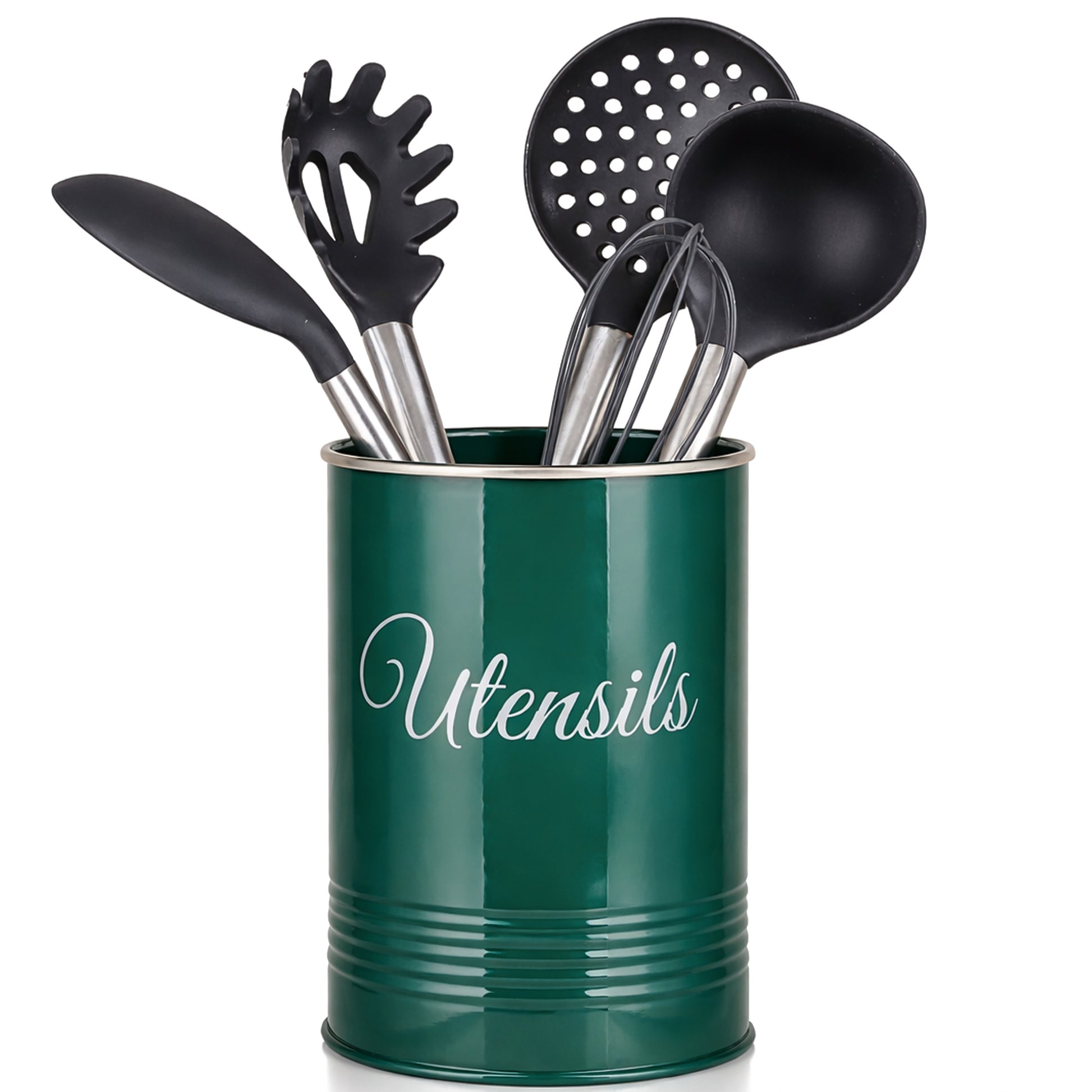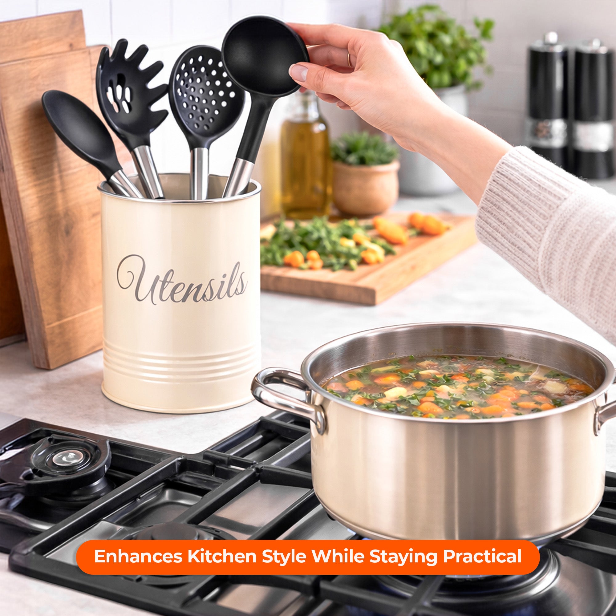 This utensil crock holder is ideal for storing ladles, spatulas, serving spoons, whisks, turners, and other everyday kitchen tools.